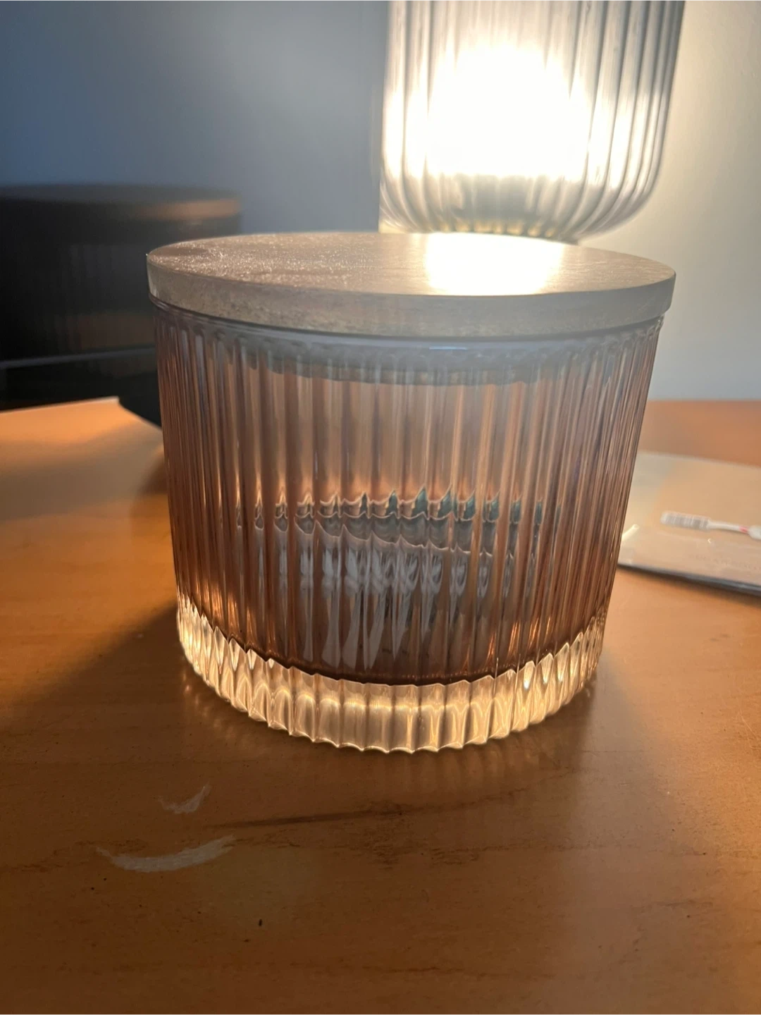 45I have a wood and glass storage jar with a lid. It's in great condition and ready for a new home! The jar measures approximately 6.5 inches in diameter. See pics for dimensions. Smoky glass canister with a wooden lid with rubber seal. A beautiful way to store things. Currently using as storage for small trinkets in the bedroom, but can be used as kitchen storage as well.