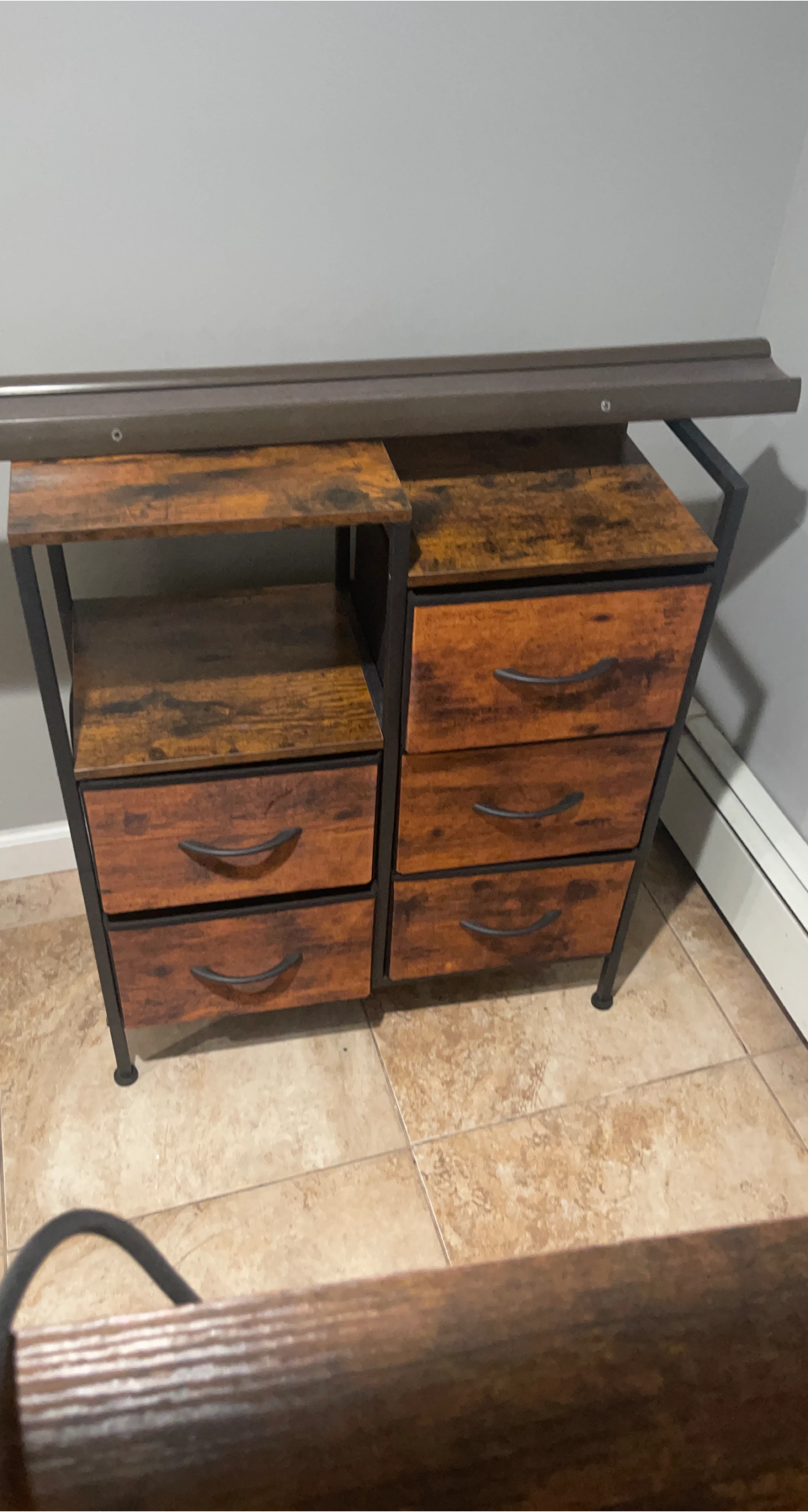 This dresser features a rustic wood finish with a sturdy metal frame. It has a combination of drawers and open shelves for versatile storage options. The drawers have curved metal handles.