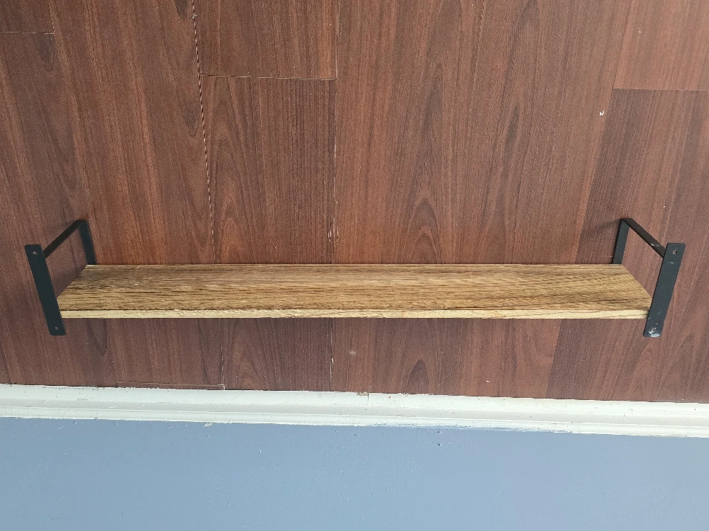 13Selling a wood shelf with black metal brackets. It's in great condition and ready to add some rustic charm to your space! Perfect for displaying your favorite items or adding extra storage to any room