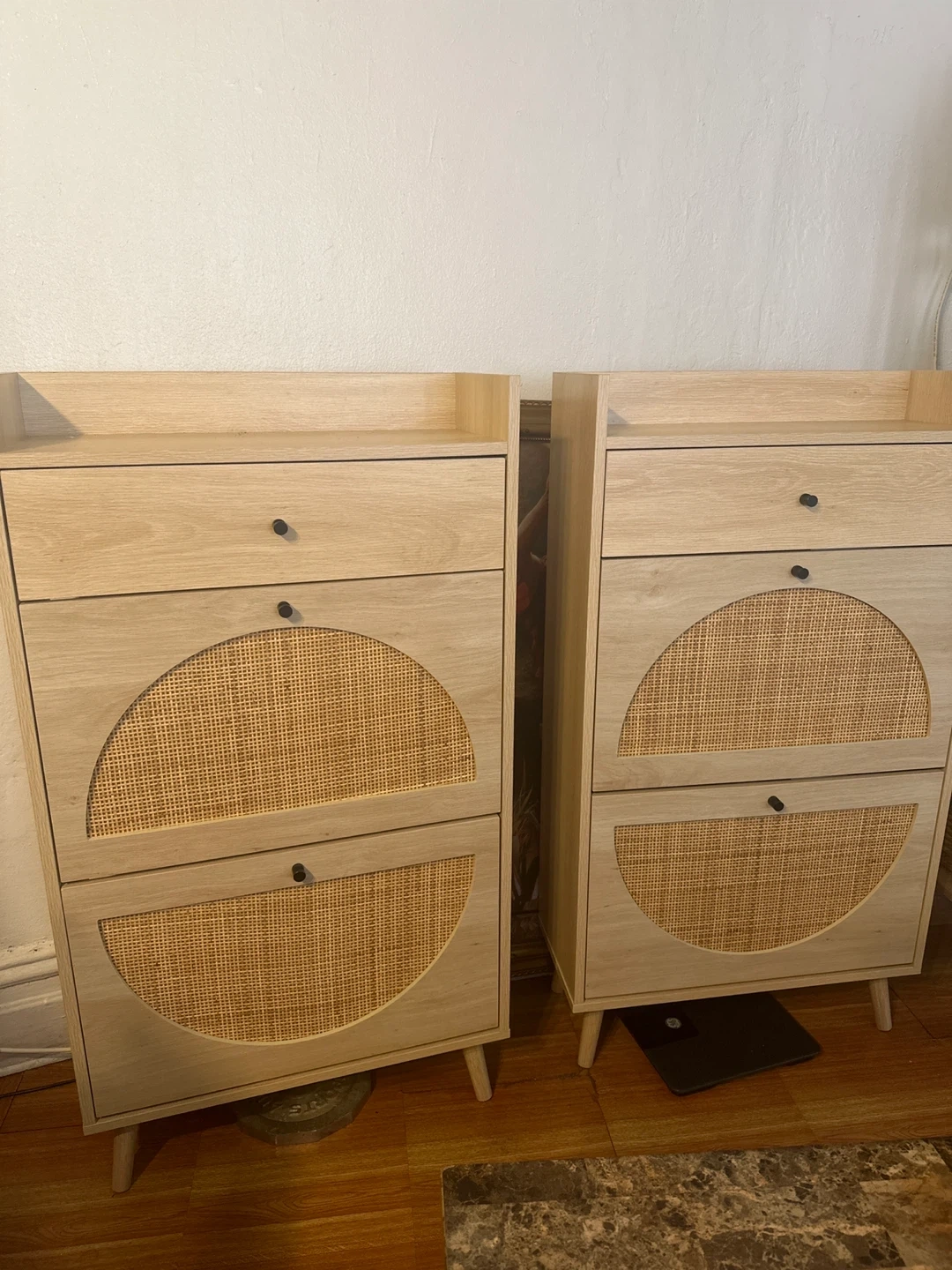 0It has a light wood finish and stylish rattan detailing on the drawers. It's in great condition and would be a lovely addition to any bedroom or living space Pick-up only Good as new