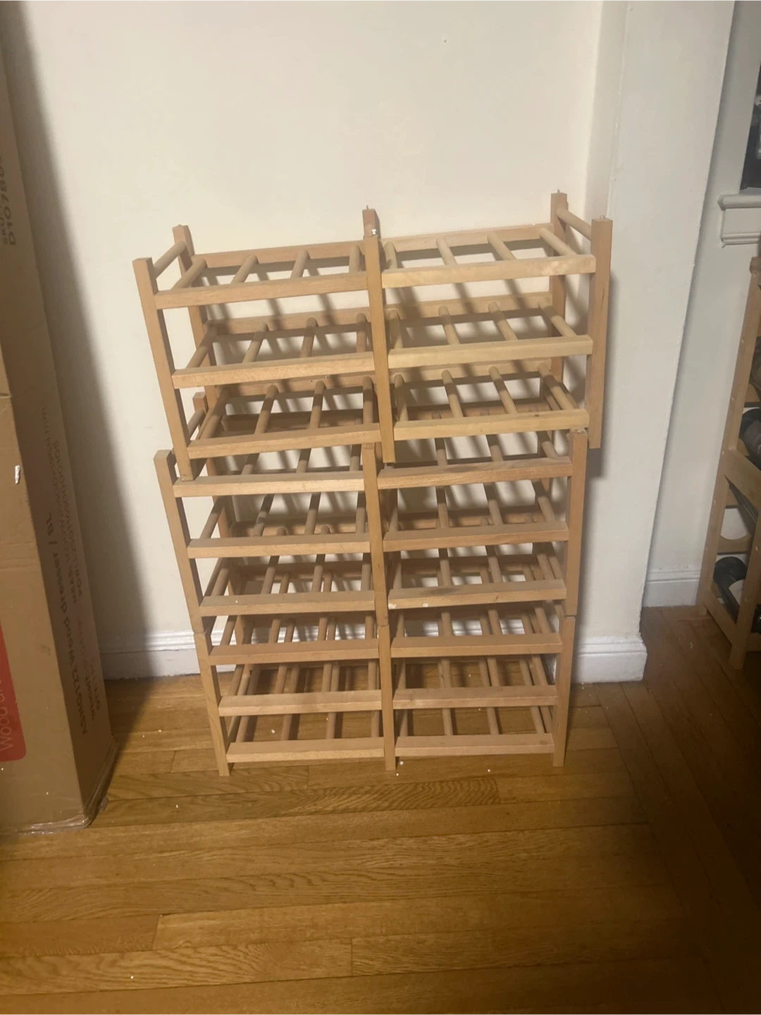 10Here are three wooden wine racks that can be stacked to hold 54 bottles! They are in good condition and ready for a new home. Perfect for storing your wine collection or just getting started. Or individually can hold 9 bottles.