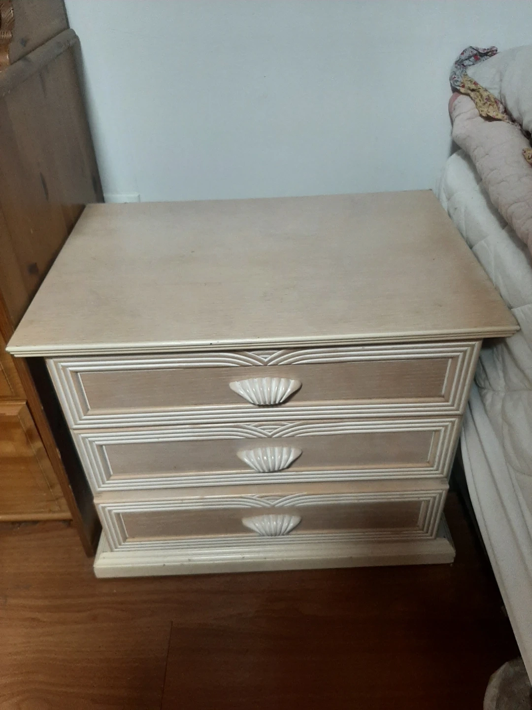 172Here's a wooden nightstand with three drawers. It has a light color and a decorative shell design on each drawer. It's perfect for adding some extra storage to your bedroom