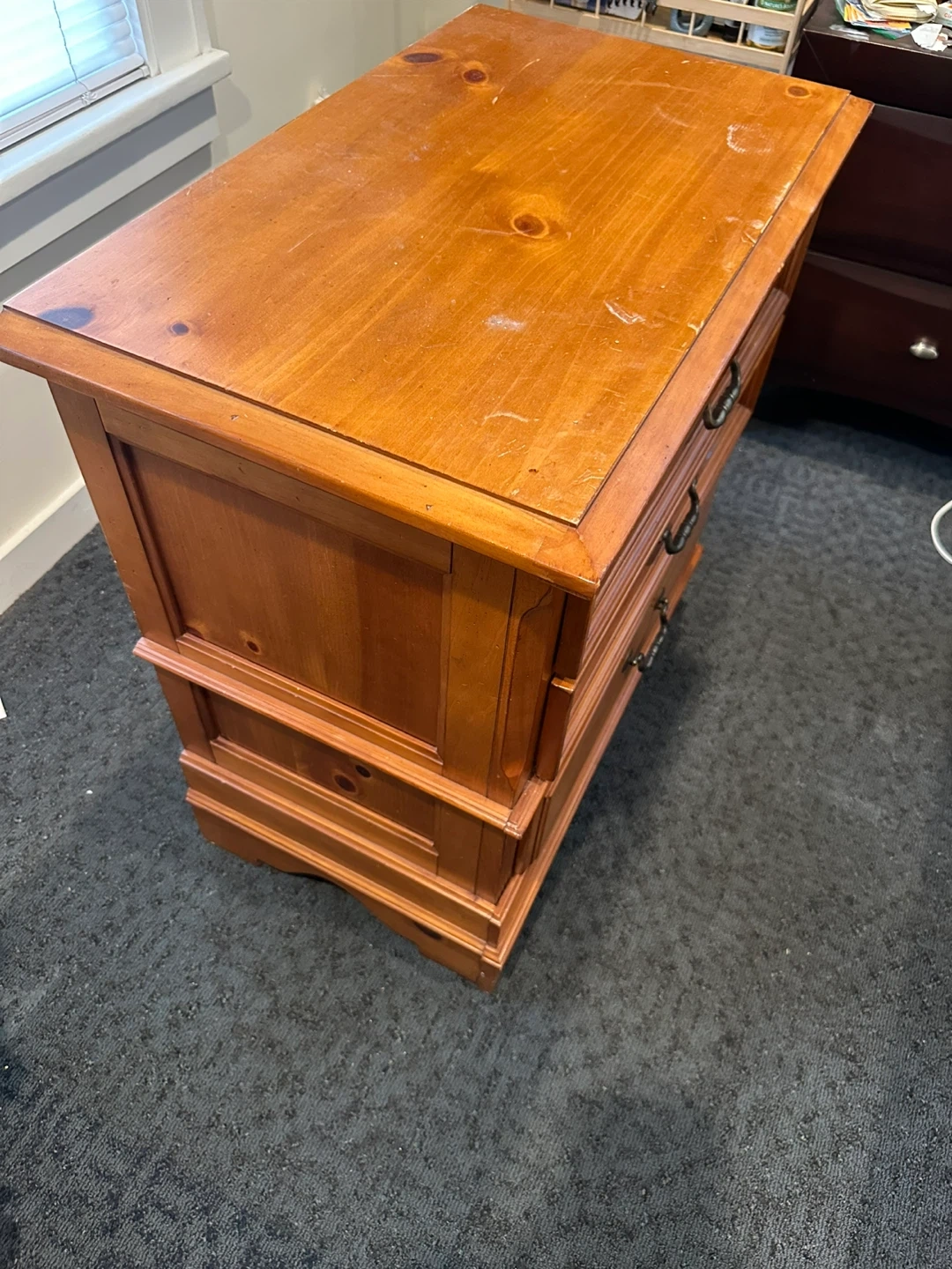 10Here's a wooden nightstand with three drawers. It has a classic look with dark metal handles. The wood has a warm tone. It's a sturdy piece for your bedroom or living room