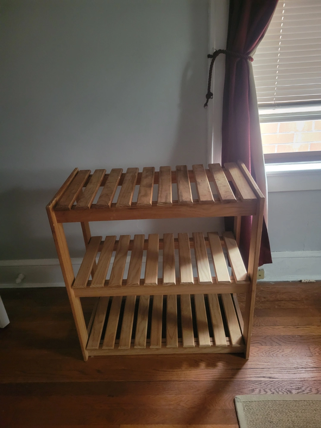 14Simple wooden shoe rack. Three shelves. Light wood finish. Perfect for entryway.