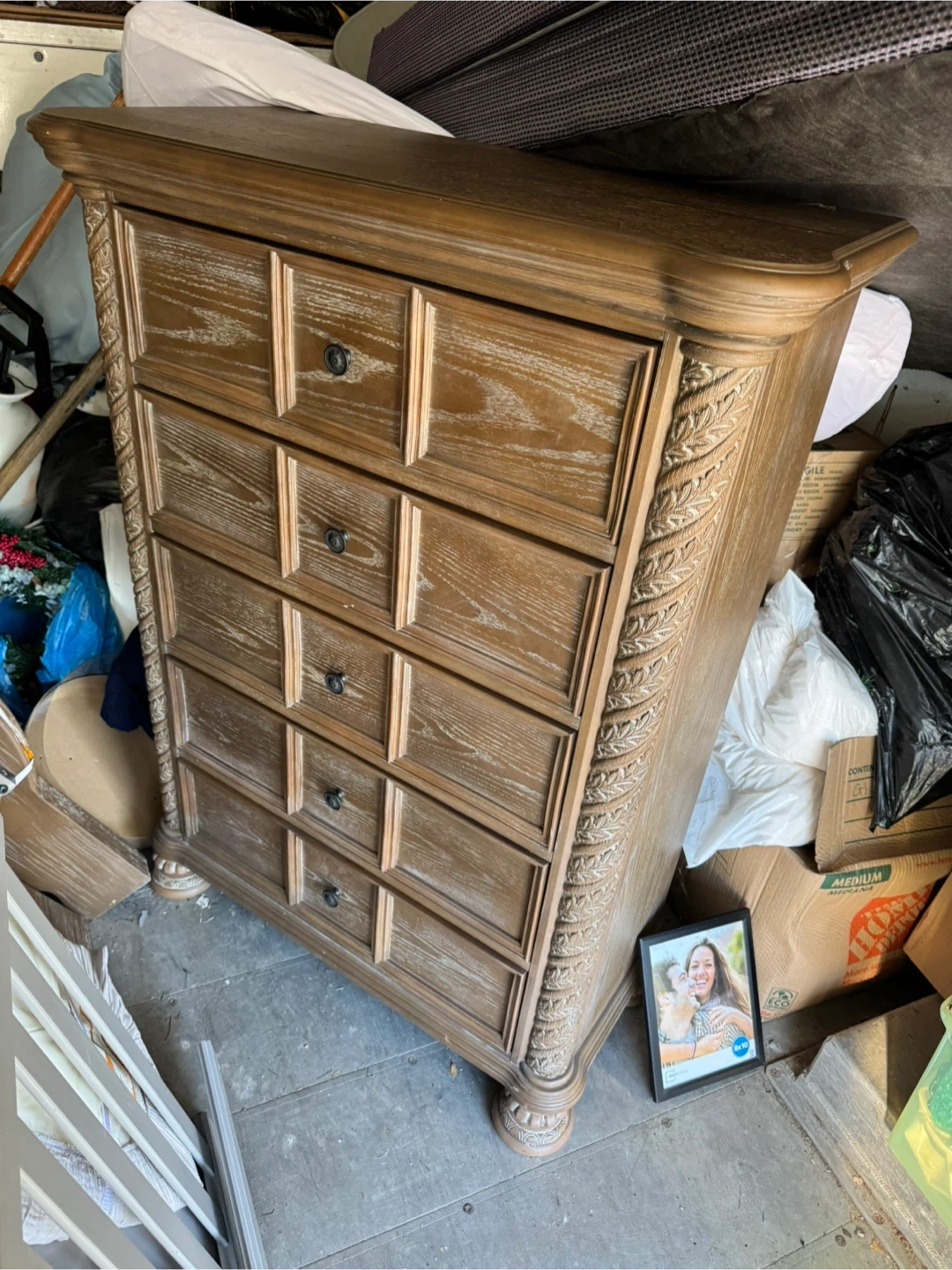 89Selling a wooden dresser with five drawers. It has a brown finish and decorative carved details on the sides. The drawers are spacious. Great for extra storage in your bedroom or closet! 39” x 18” x 53” **Willing to Deliver**