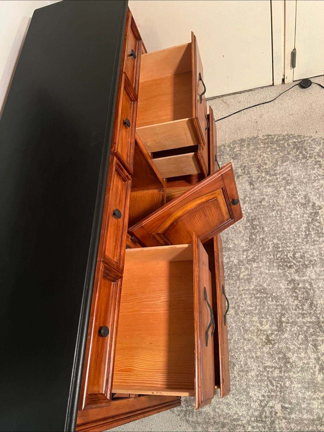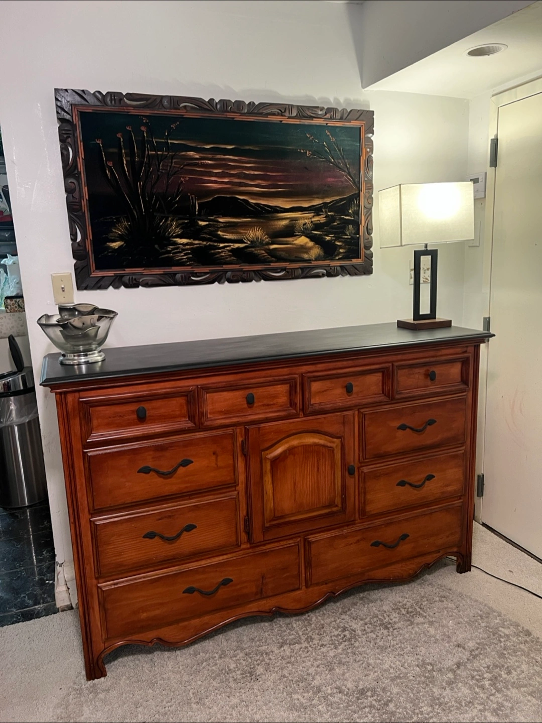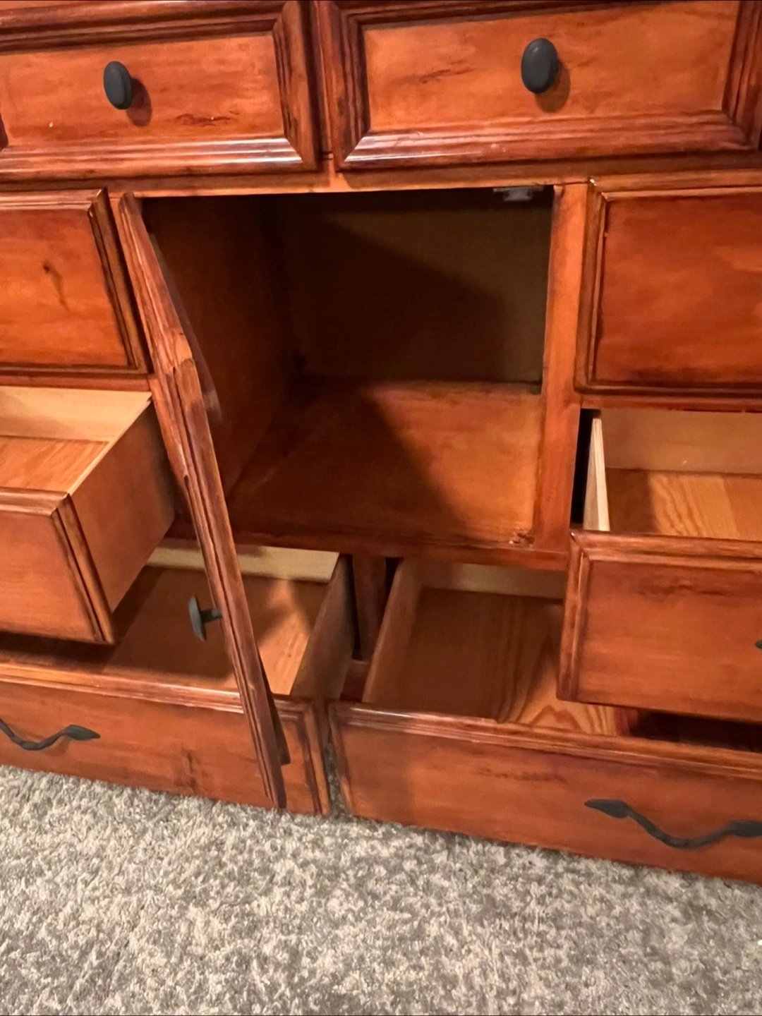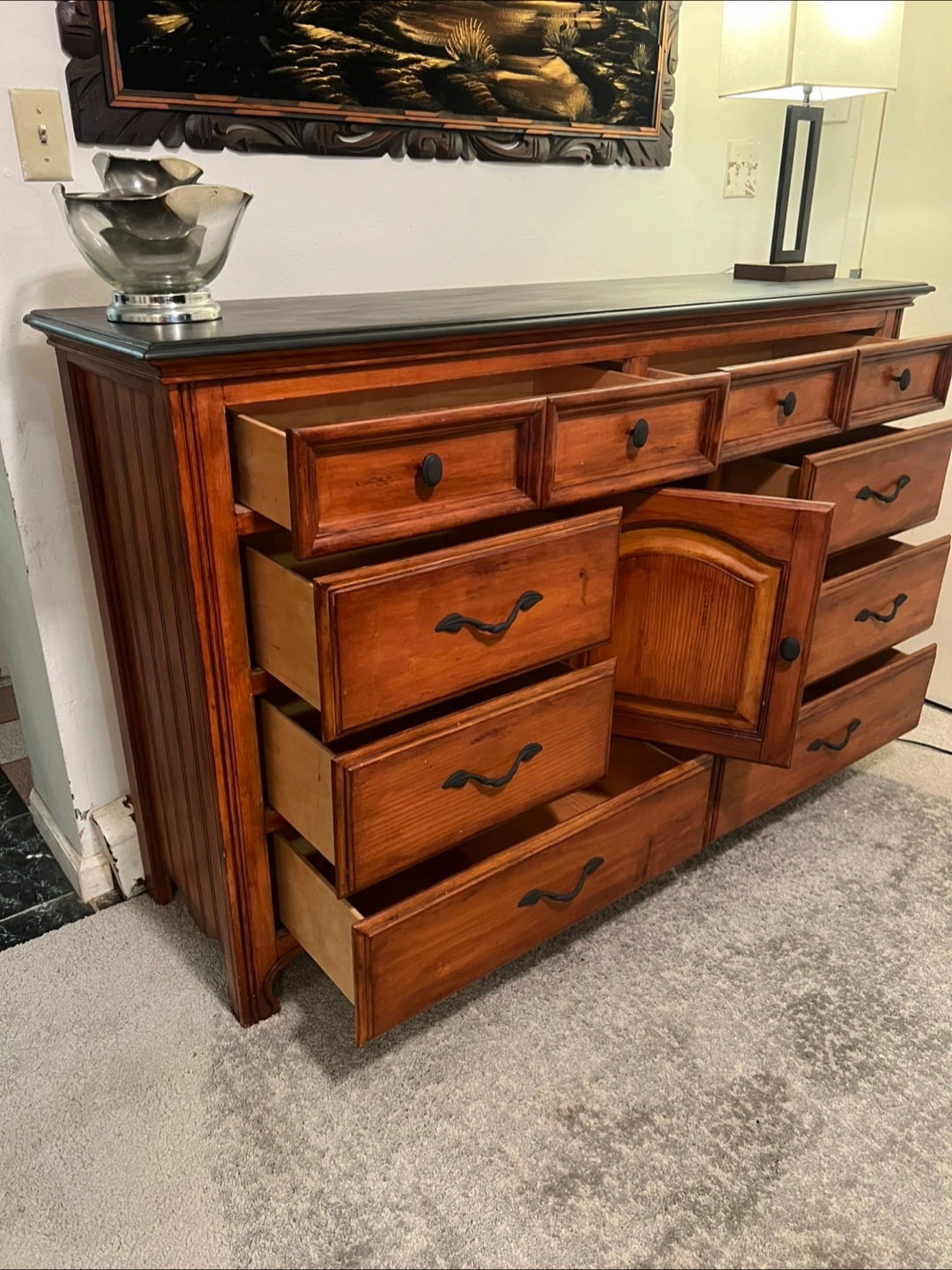 415This is a well-maintained dresser crafted predominantly from solid wood, featuring eight drawers along with a central cabinet. The drawers operate just fine, demonstrating functionality without any issues. The construction is robust, and there are no broken components; however, there are minor signs of wear/imperfections on the surface. Dimensions are as follows: 18 inches (depth) x 64 inches (width) x 40.5 inches (height). Delivery services can be arranged for an additional fee, which will be customized based on your location. Accepted payment methods include cash, Venmo, Zelle, and CashApp.