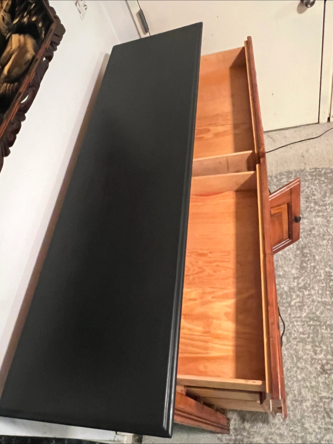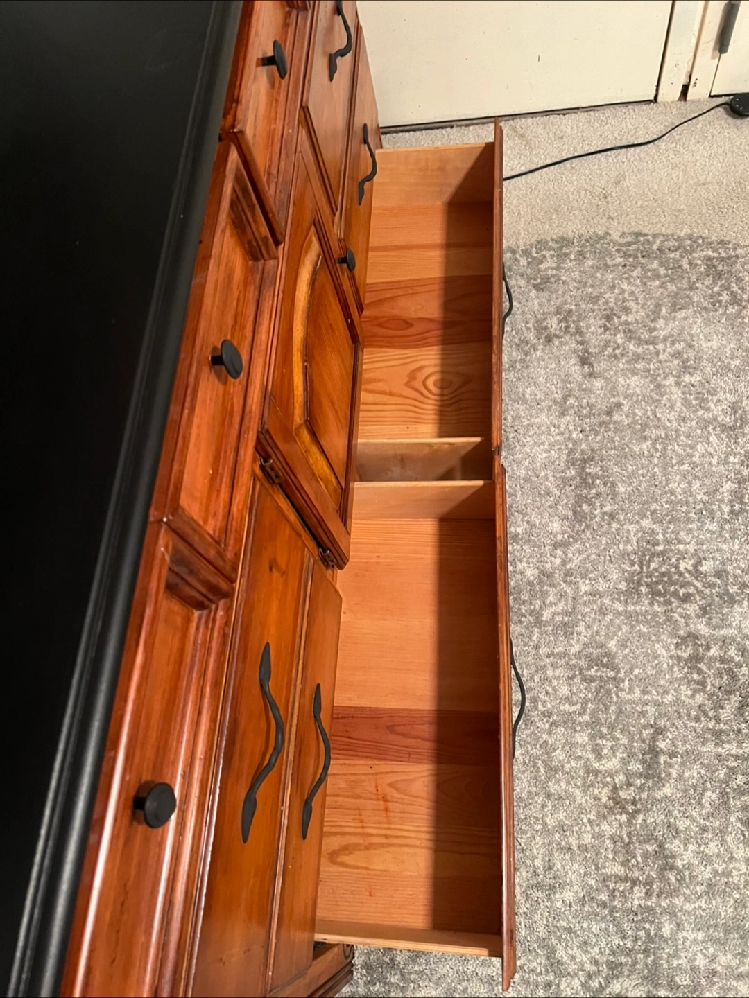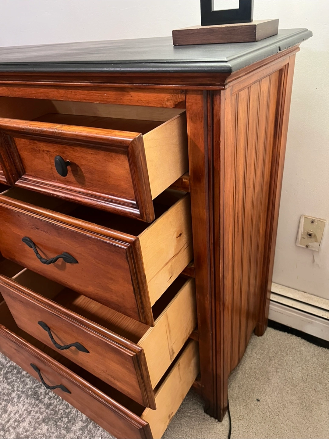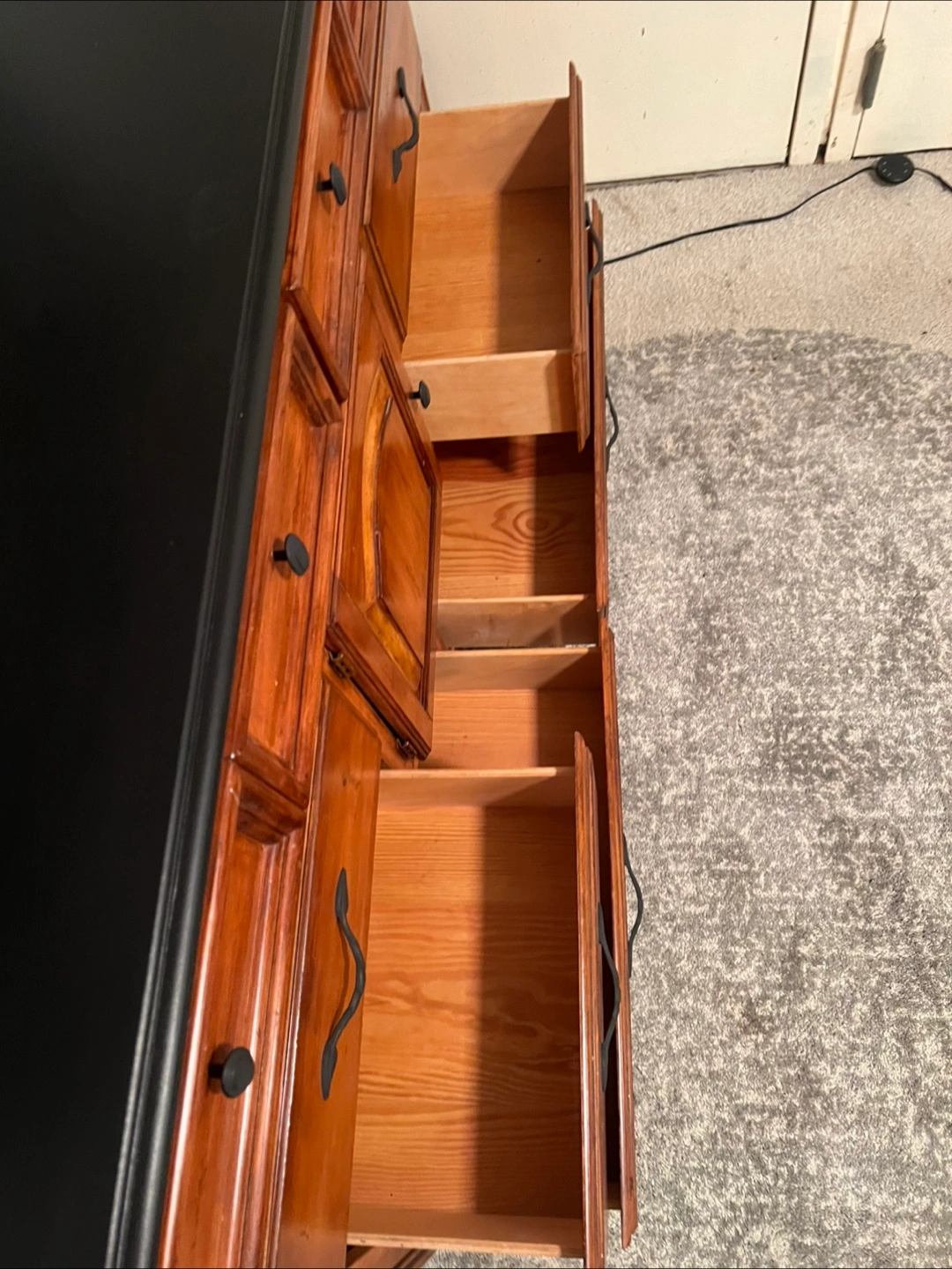 415This is a well-maintained dresser crafted predominantly from solid wood, featuring eight drawers along with a central cabinet. The drawers operate just fine, demonstrating functionality without any issues. The construction is robust, and there are no broken components; however, there are minor signs of wear/imperfections on the surface. Dimensions are as follows: 18 inches (depth) x 64 inches (width) x 40.5 inches (height). Delivery services can be arranged for an additional fee, which will be customized based on your location. Accepted payment methods include cash, Venmo, Zelle, and CashApp.