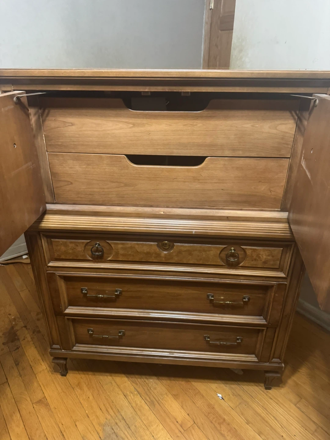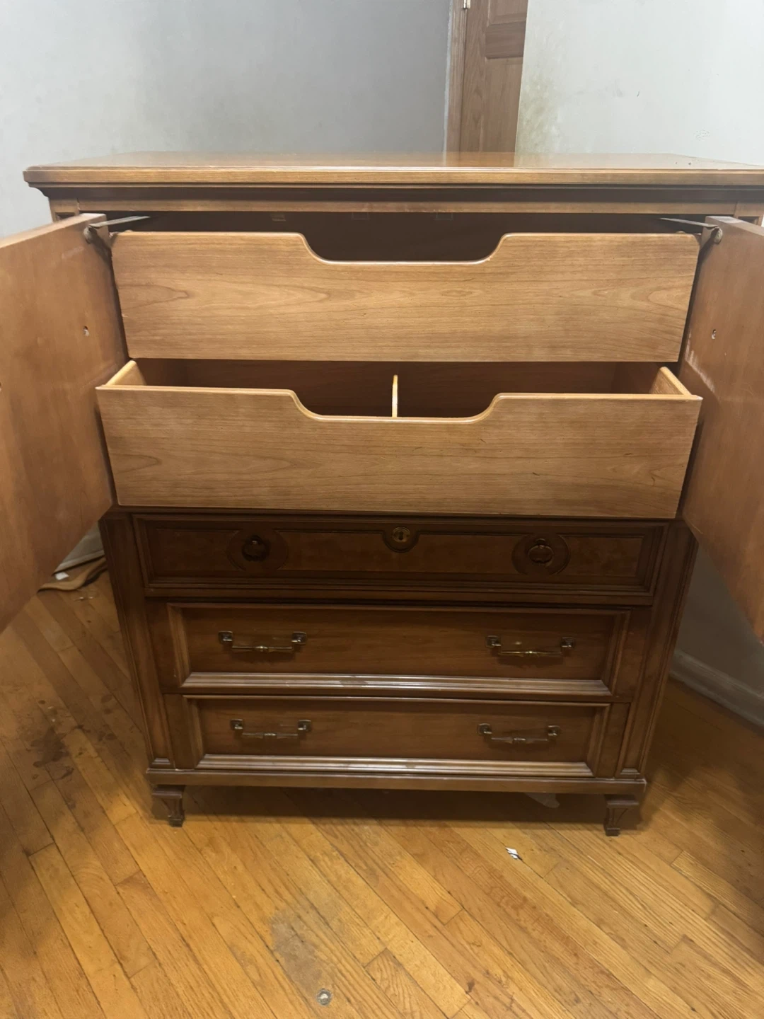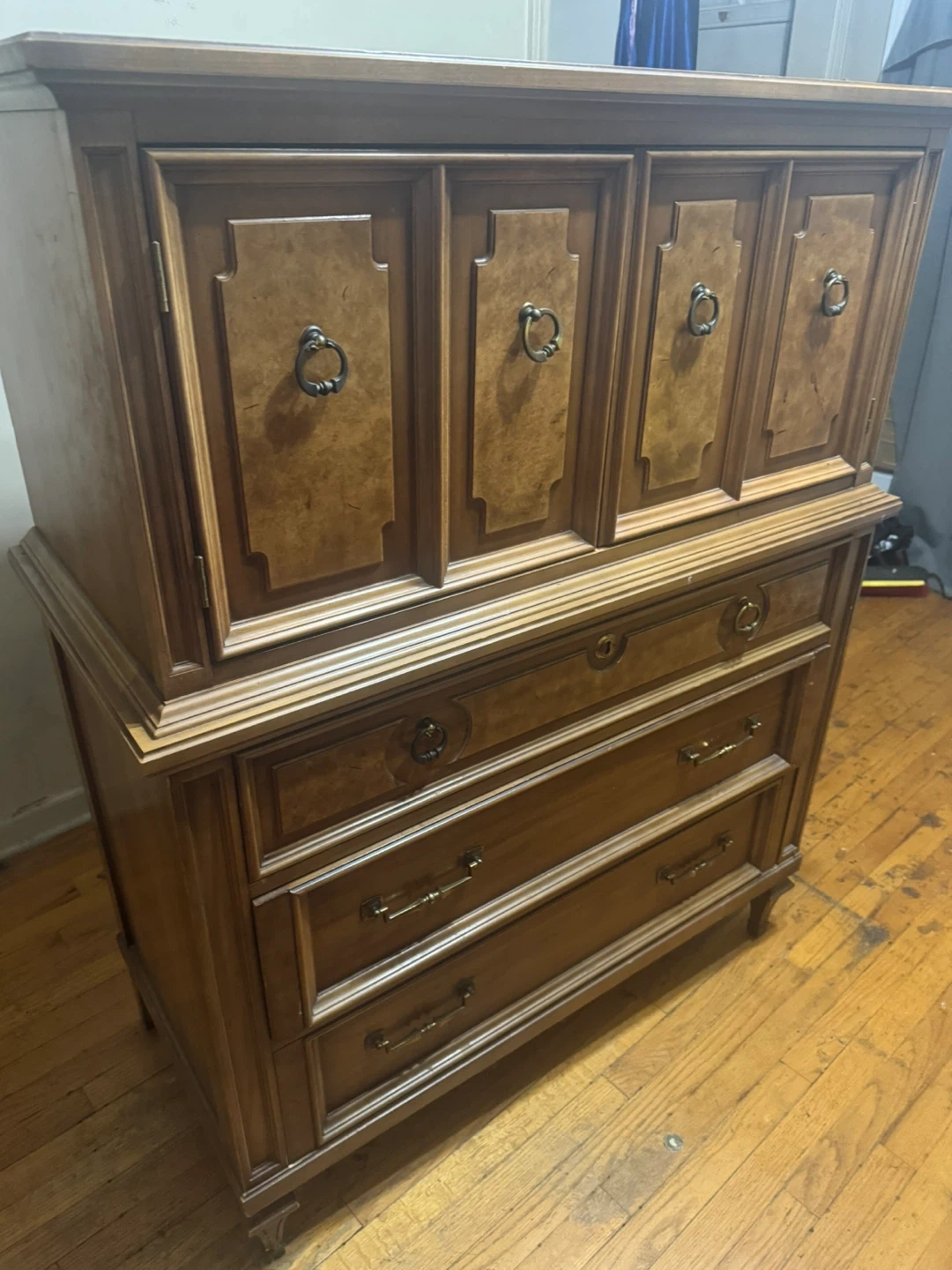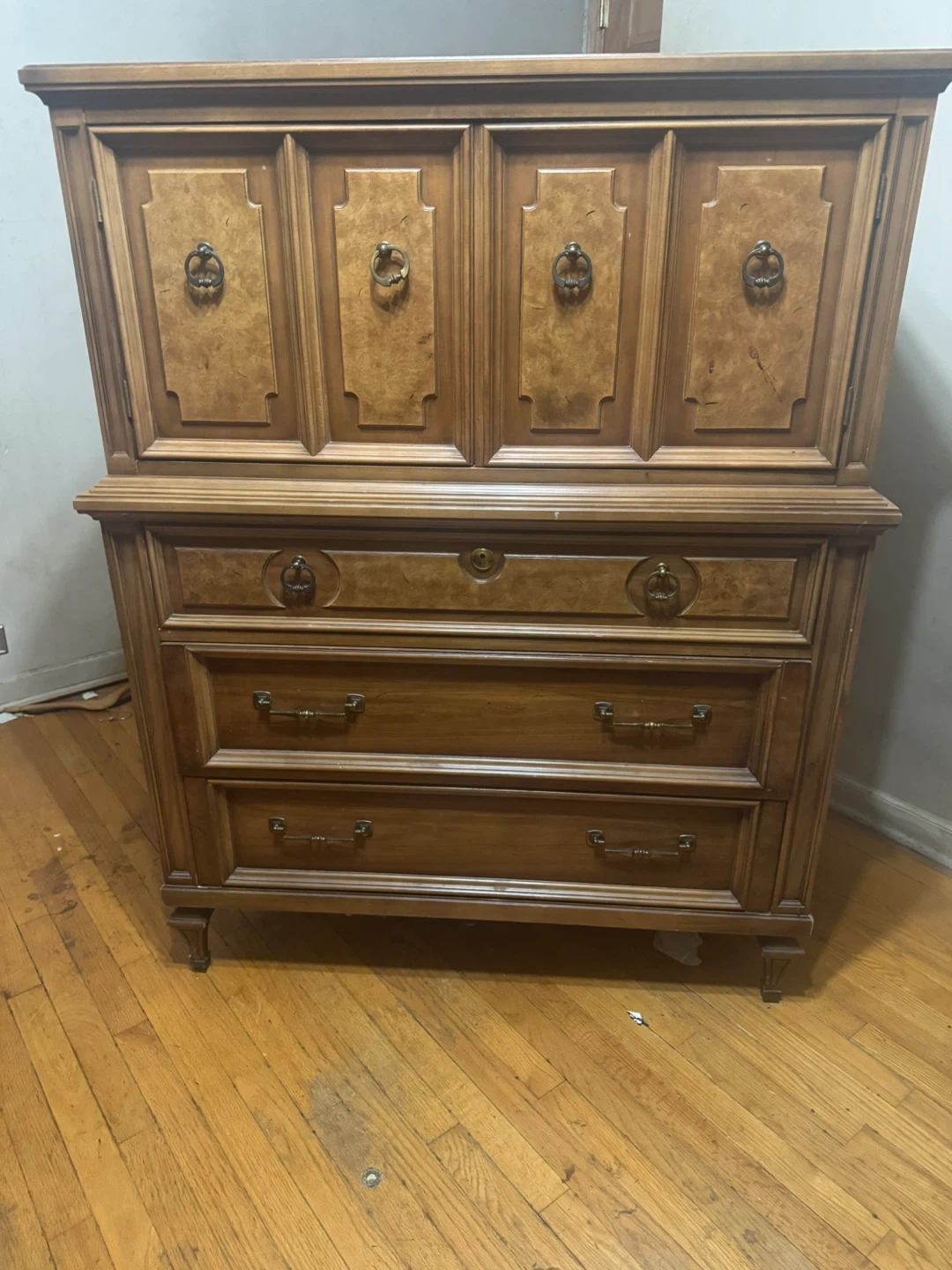 Selling a wooden armoire dresser! It has a classic design with multiple drawers and cabinet space. Perfect for adding storage and style to any bedroom or living area. CASH ONLY PLEASE !!!