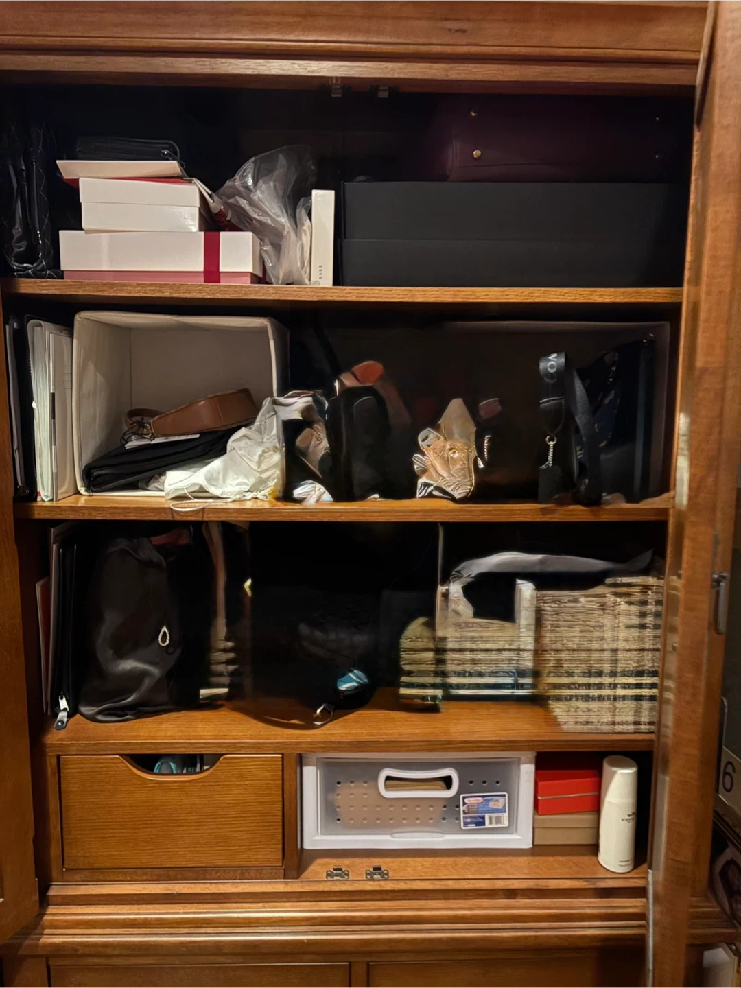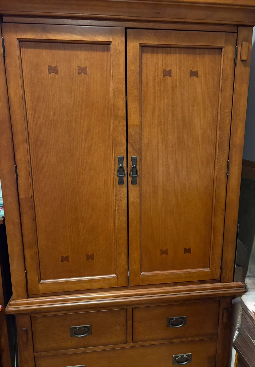 63Selling a wooden armoire in good condition. It's a great piece of furniture for storage and organization. The armoire has a classic design with two doors and drawers at the bottom, offering ample space for clothes and other items. It has a warm, inviting look that would complement any room!