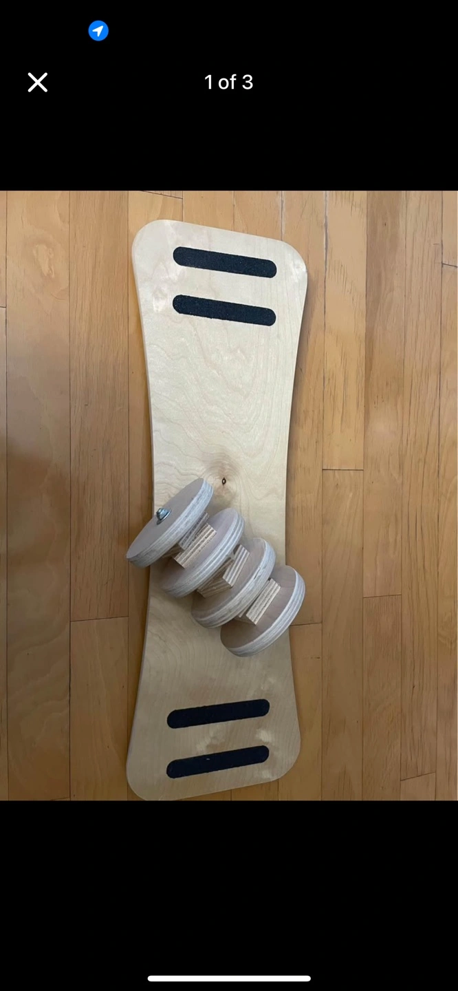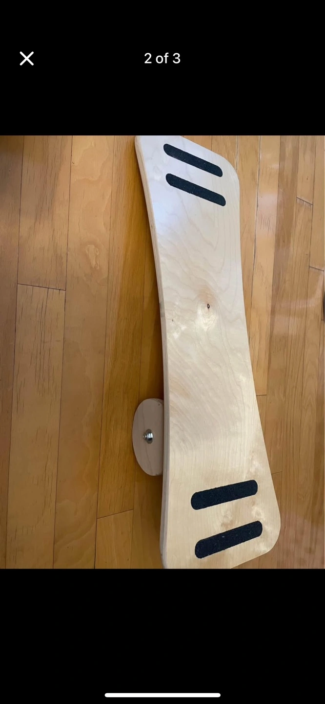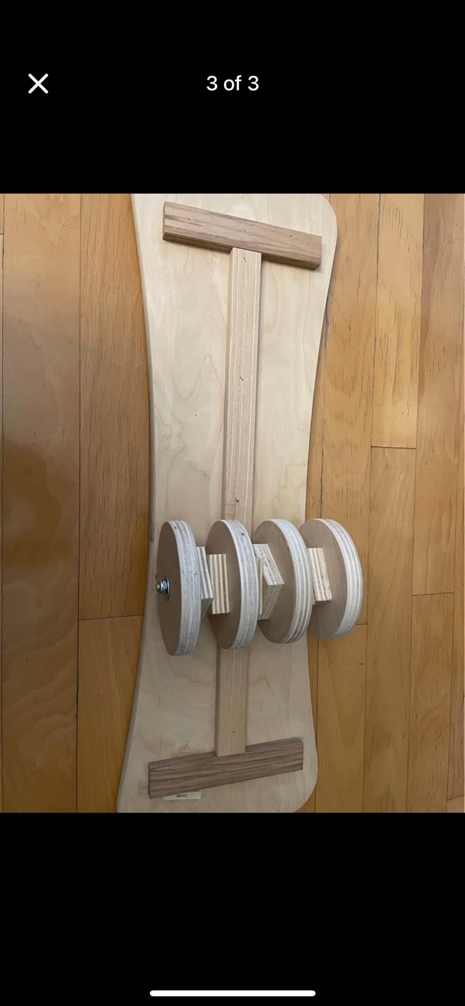 Balance board made of wood. Features three rollers. Good for core strengthening and balance exercises. Lightweight and easy to store.
