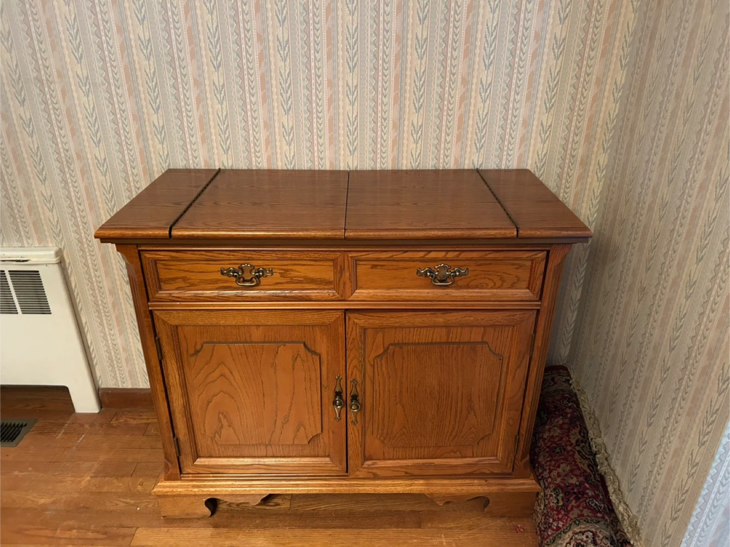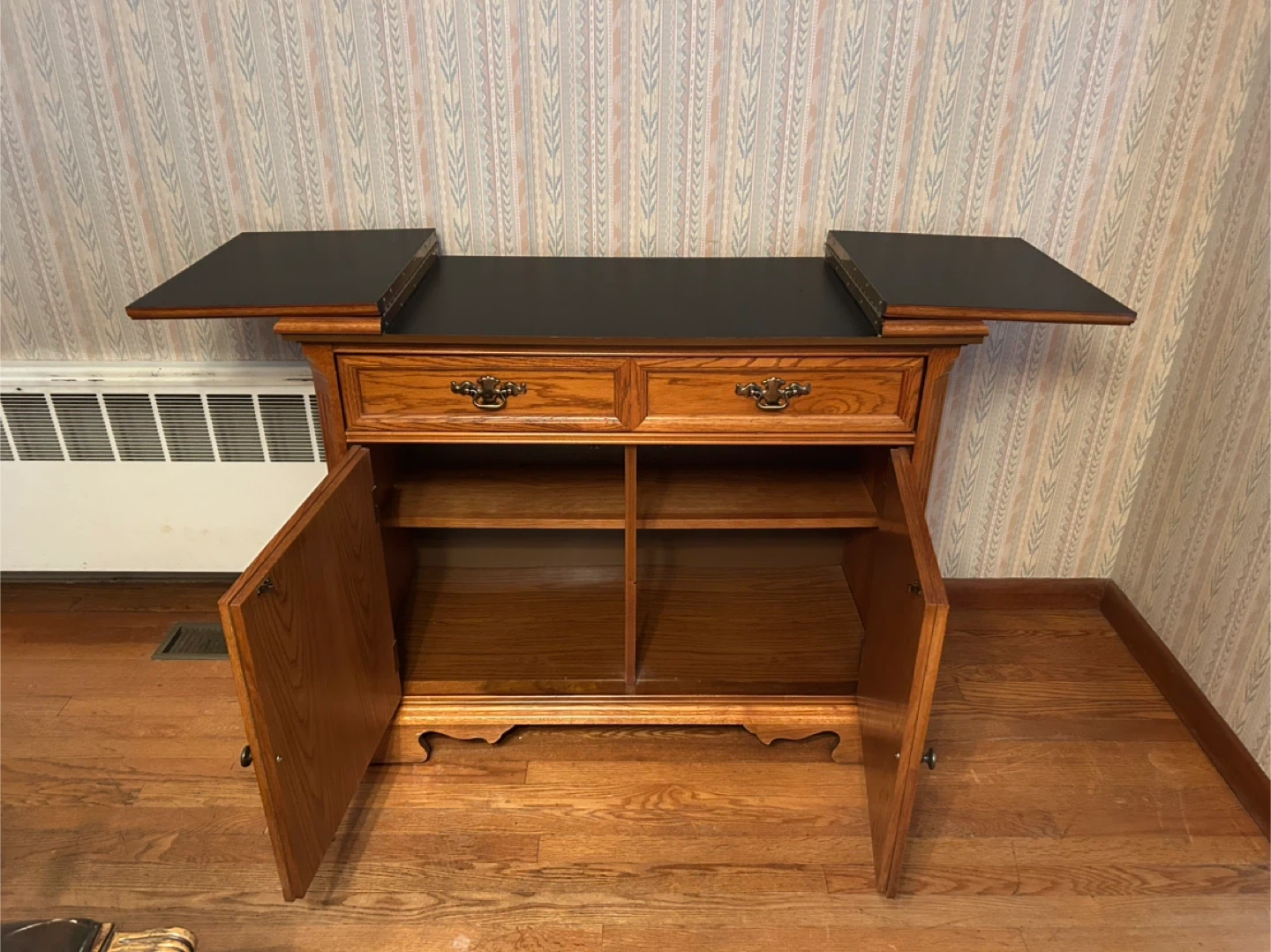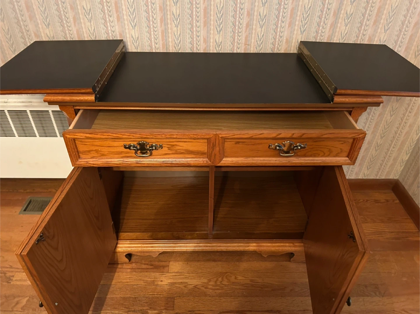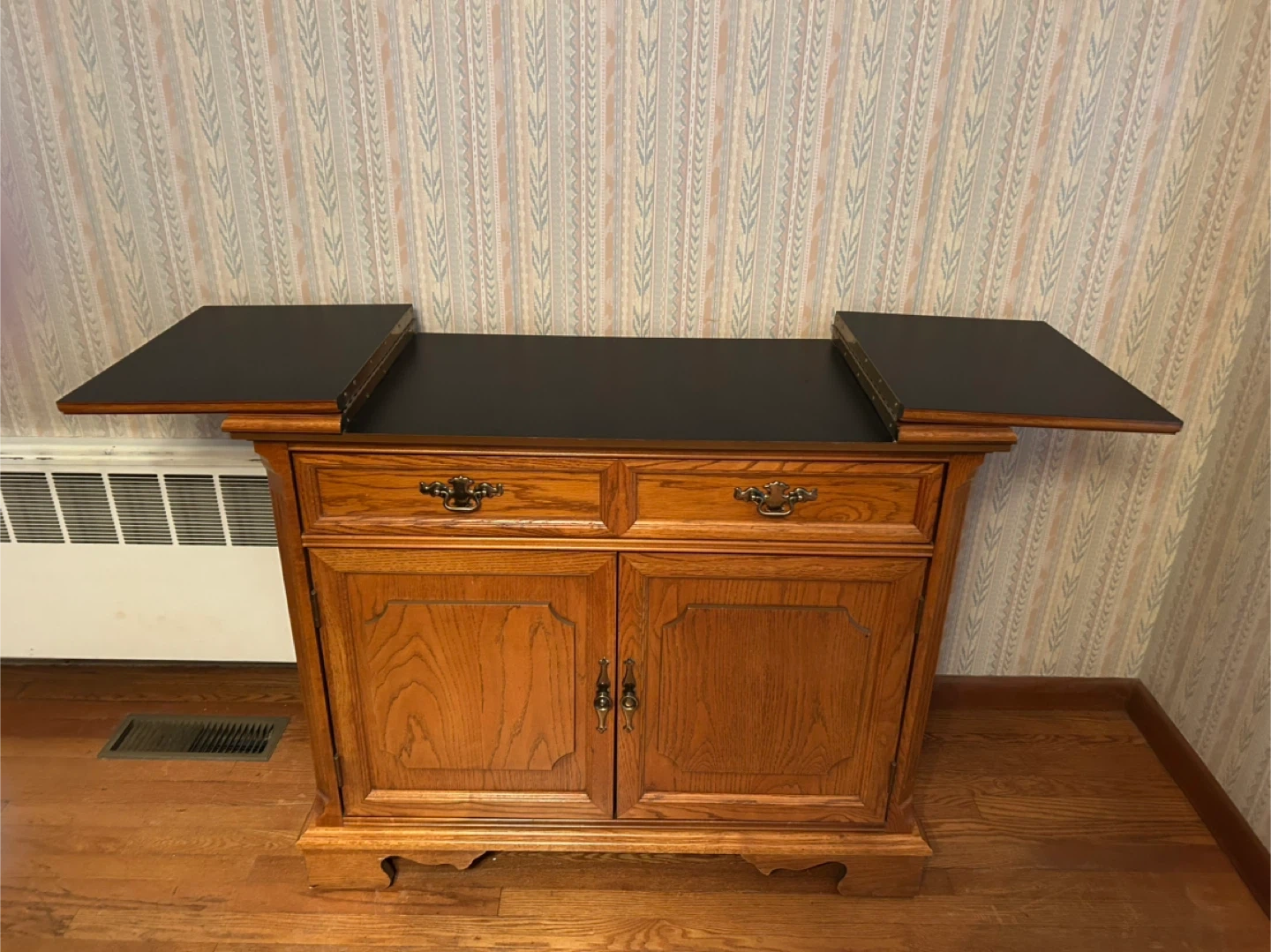 5This is a wooden bar cabinet with a warm, inviting finish. It features two drawers and cabinet space for storage. The top has two leaves that can be extended for extra surface area. It's perfect for storing your favorite drinks and bar accessories!