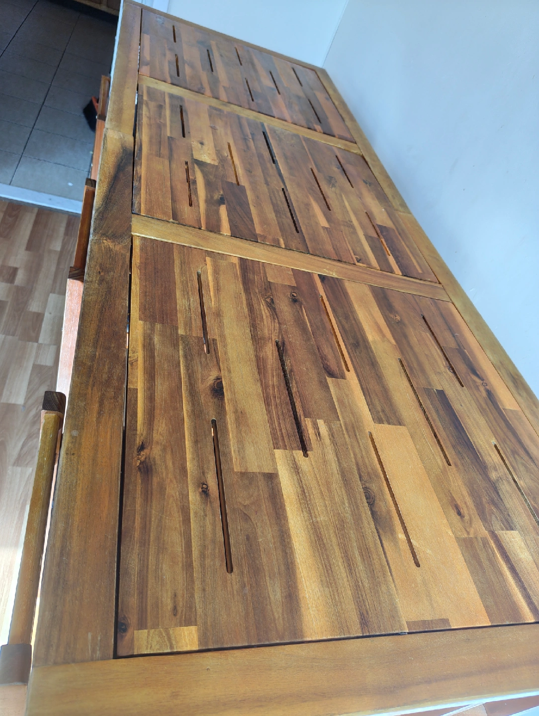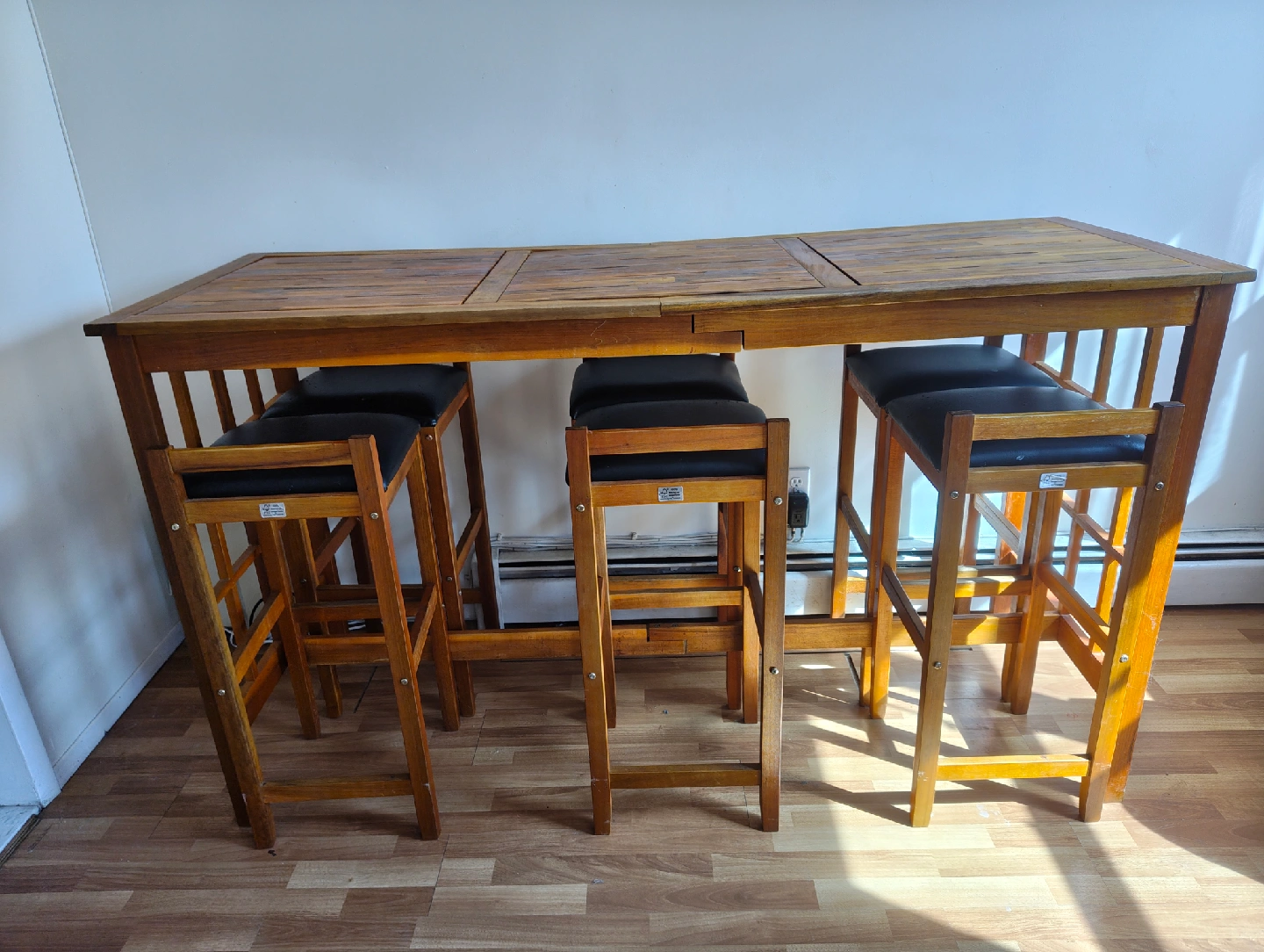 Solid wood table and chairs available. Unique style and all natural wood. Table has some wear and tear but comes with extra top middle piece ordered as a replacement that is new in the box. Chairs have some wear and tear on cushion but wood is in excellent condition. Table 71 x 26.5 x 41.25 Chairs 14.25 x 13.75 x 33.5 Items available for $75 or best offer and pick-up in Kew Gardens, Queens area.