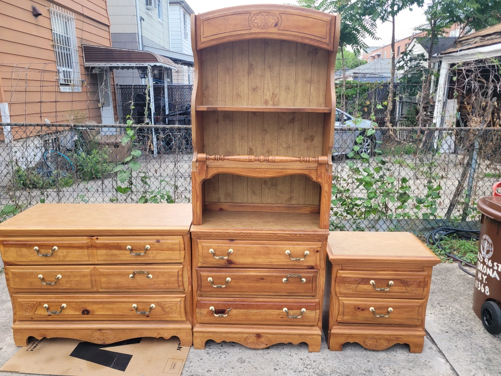 Selling a wooden bedroom set that includes a dresser, hutch, and nightstand. It's a matching set with a classic design and brass-colored hardware. Perfect for adding some traditional charm to your bedroom!