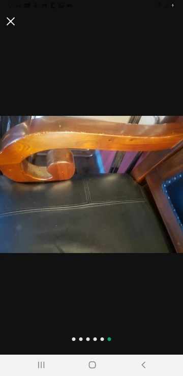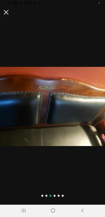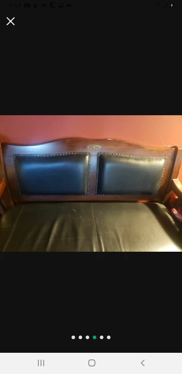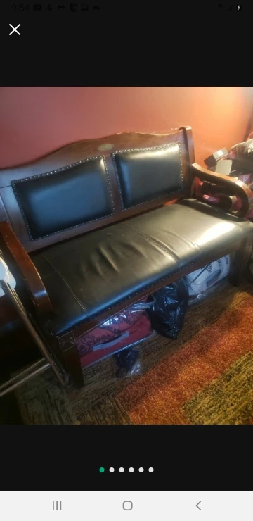 Wooden bench with a black leather seat. The bench has a storage compartment.
