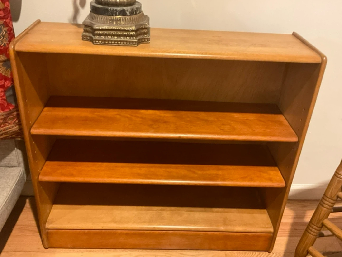 Here's a simple wooden bookcase with three shelves! It's perfect for storing books, displaying decorations, or organizing items in any room. It has a warm, natural wood tone that would complement various interior styles. It's in good condition and ready for a new home