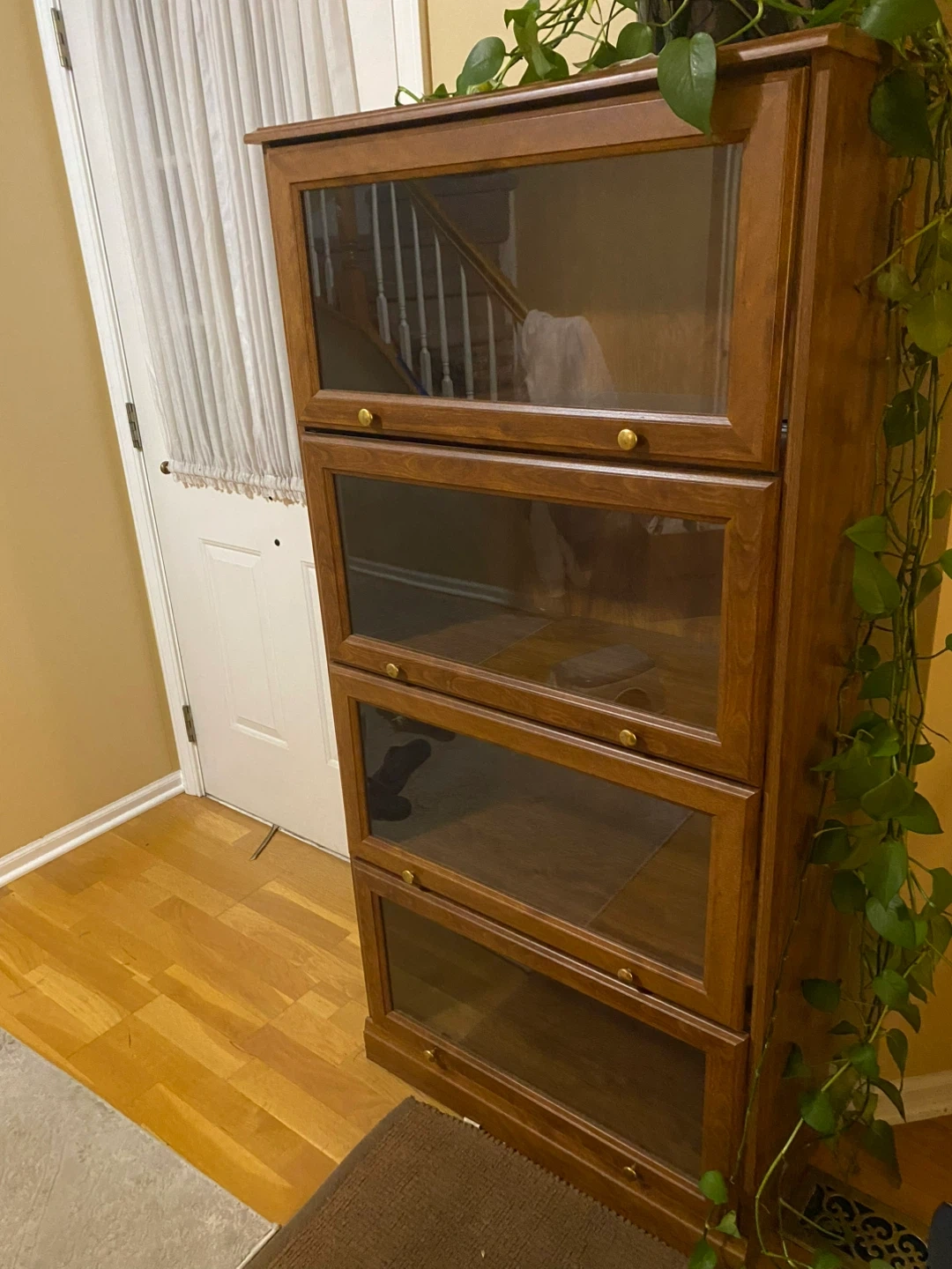 75Selling a lovely wooden bookcase! It features glass doors, perfect for displaying your favorite items or keeping things dust-free. The wood has a nice, warm tone that would complement any room