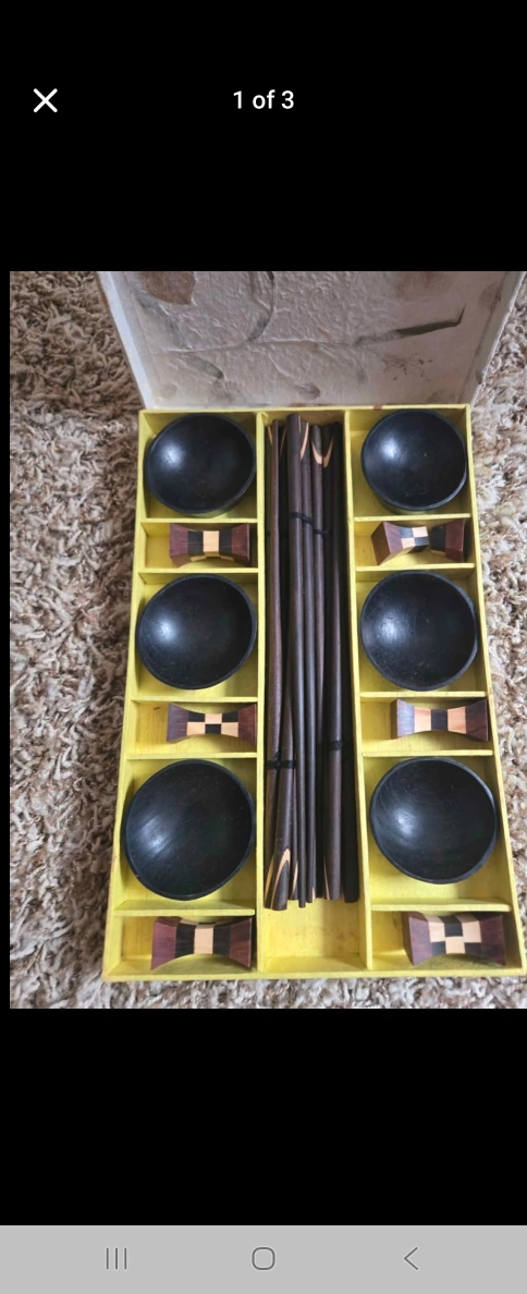 15Selling a wooden bowl and chopstick set for 5 people. The set includes bowls, chopsticks, and chopstick rests. The set comes in its original box.