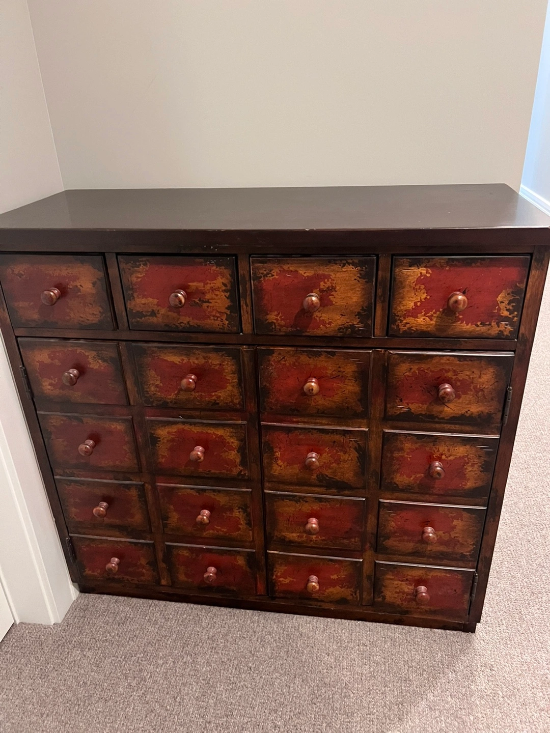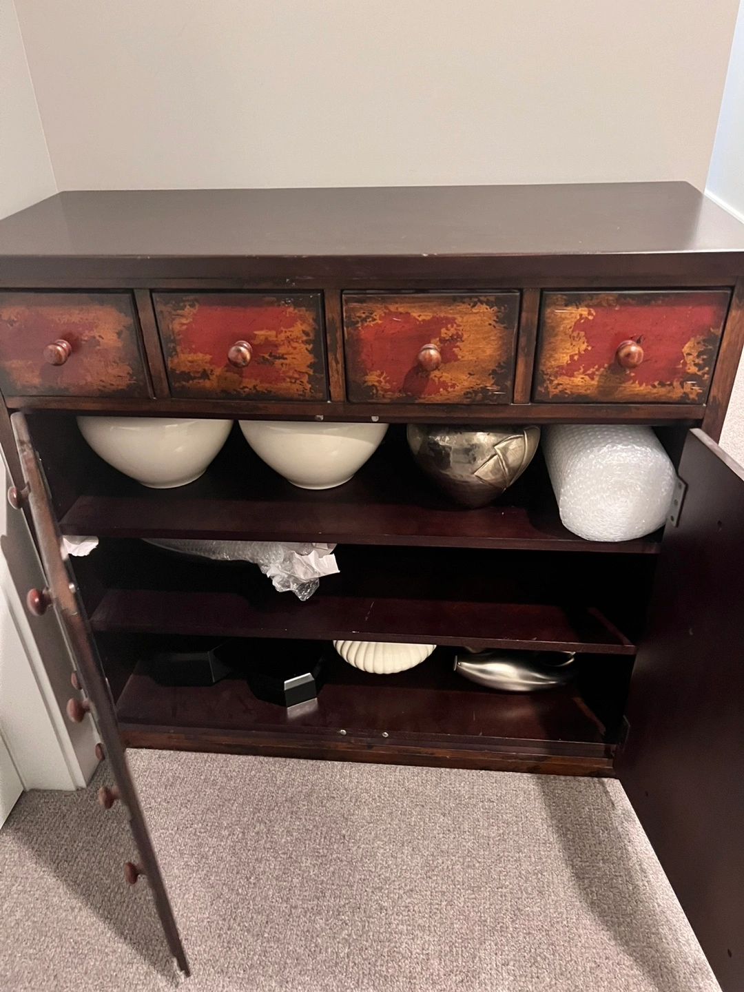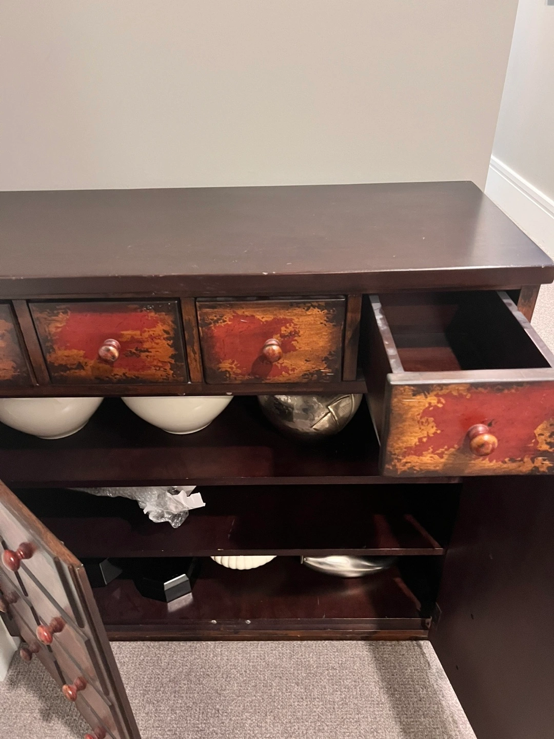 Features multiple drawers with antique-like finish. Cabinet doors open to reveal shelving for additional storage. Ideal for a tranquil space for storage.