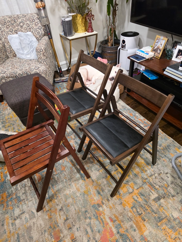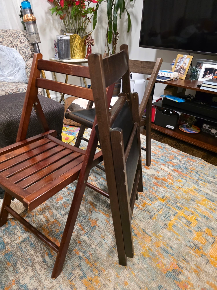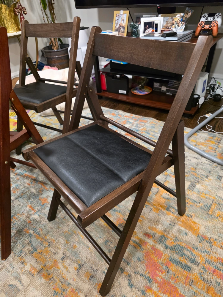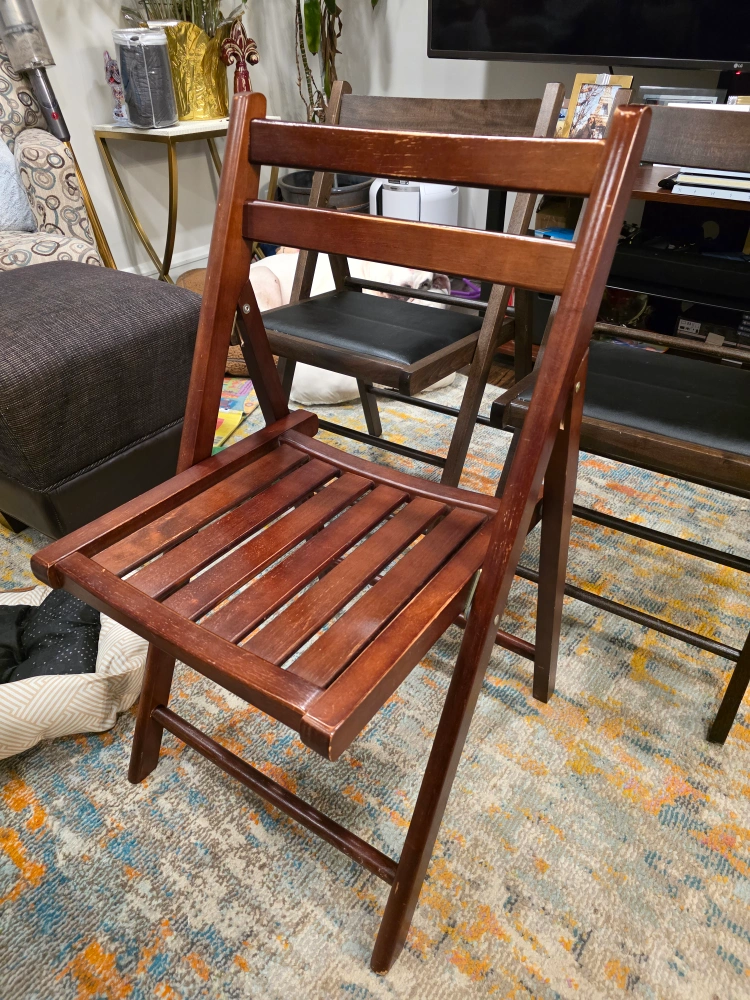 Wooden folding chairs in different tones of brown. Two have a black cushion while the other have wooden slats for seating. Imagine using these around a dining table or on your patio for a bit of extra seating in the sun