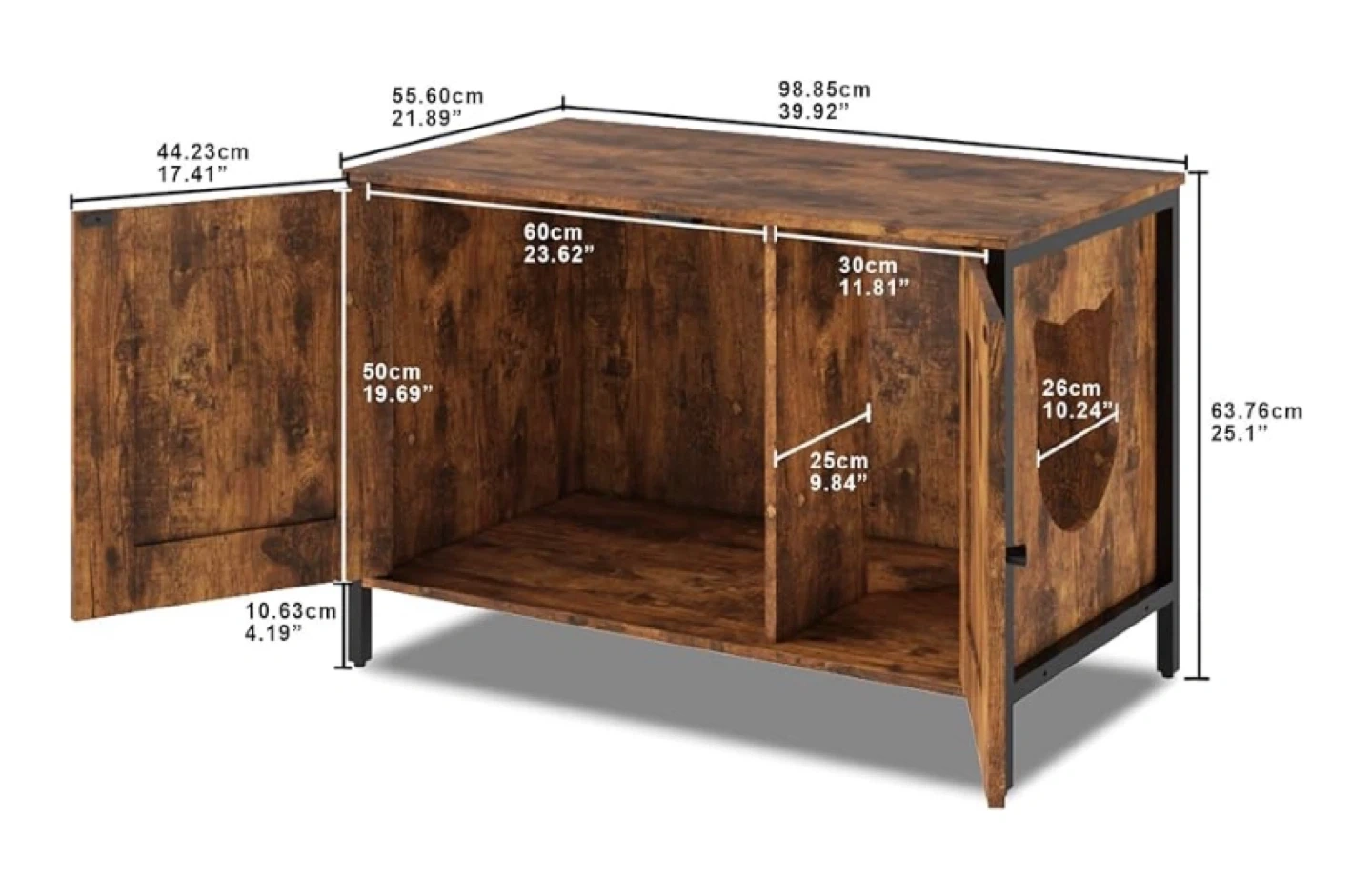 This is a wooden cat litter box enclosure that can also be used as furniture. It has a rustic brown finish with black metal legs. The dimensions are approximately 39.92" wide, 25.1" high, and 21.89" deep. The interior space for the litter box is about 23.62" wide and 19.69" high. There's also a cute cat-shaped cutout on the side!