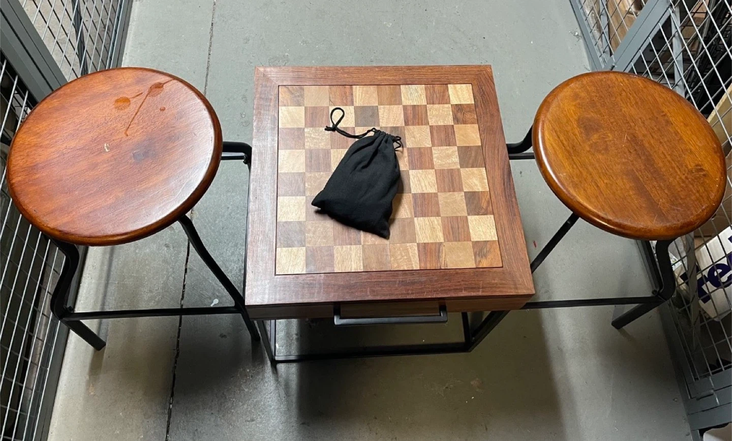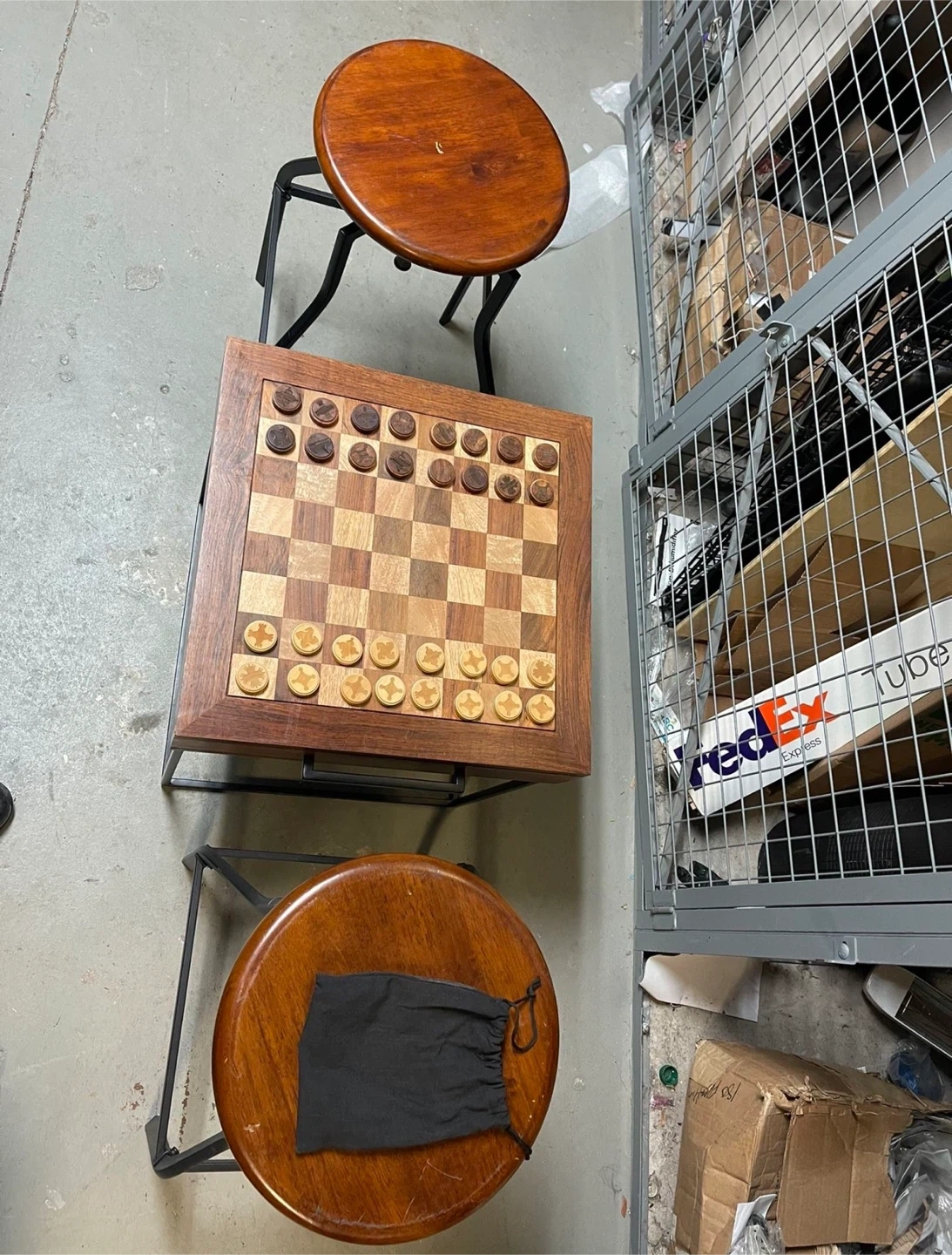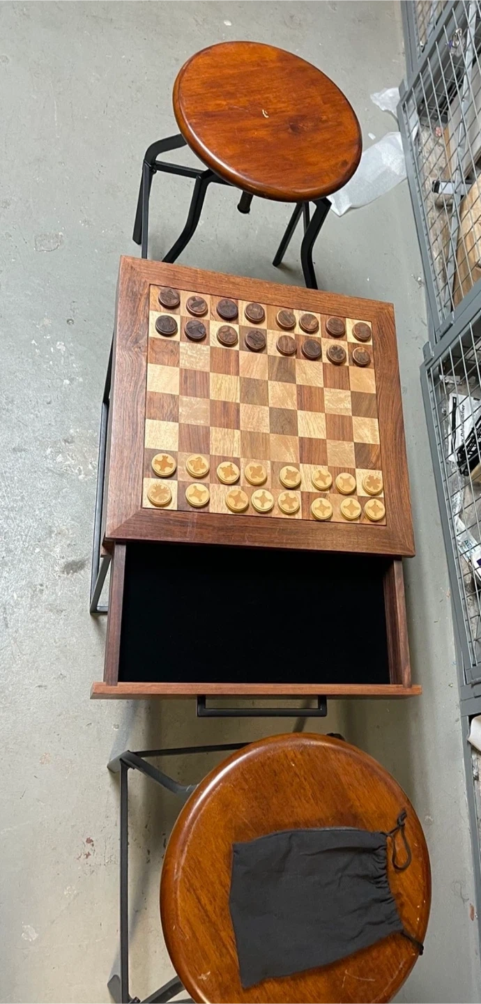 10Selling a beautiful wooden checkers/chess game table that comes with two matching stools. It's a great set for game nights or just adding a touch of classic style to your living space. The table features a built-in drawer for storing the checkers pieces when not in use