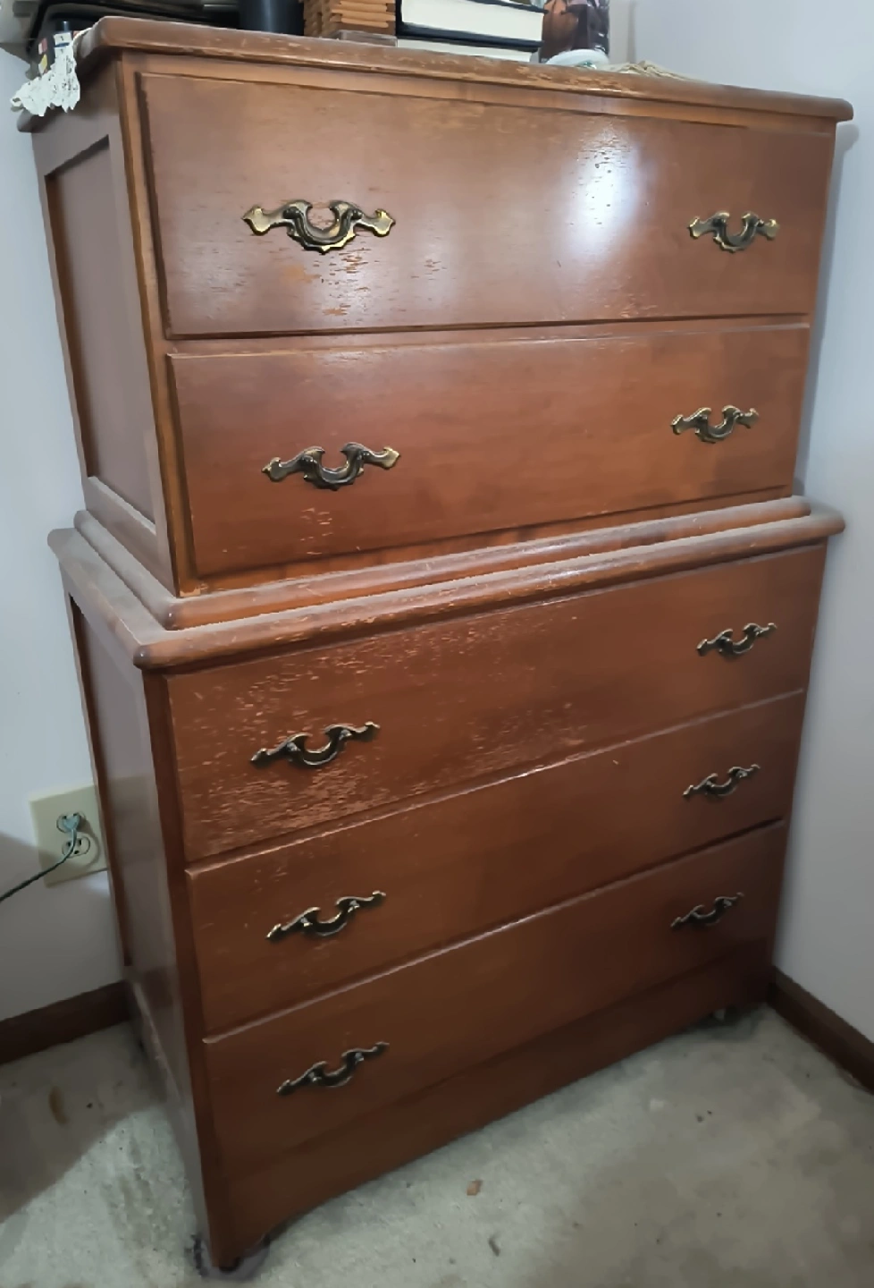 Selling a wooden chest of drawers. It features a classic design with multiple drawers for ample storage, and casters for movability. Great for organizing your clothes or other items!