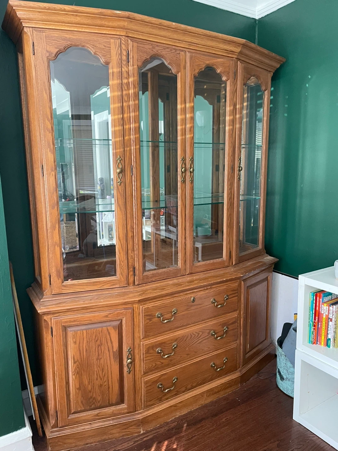 70Selling a wooden china cabinet with glass doors. It has a beautiful design and plenty of space for storage and display. The cabinet features multiple shelves and drawers, perfect for organizing your belongings. It also has interior lighting.
