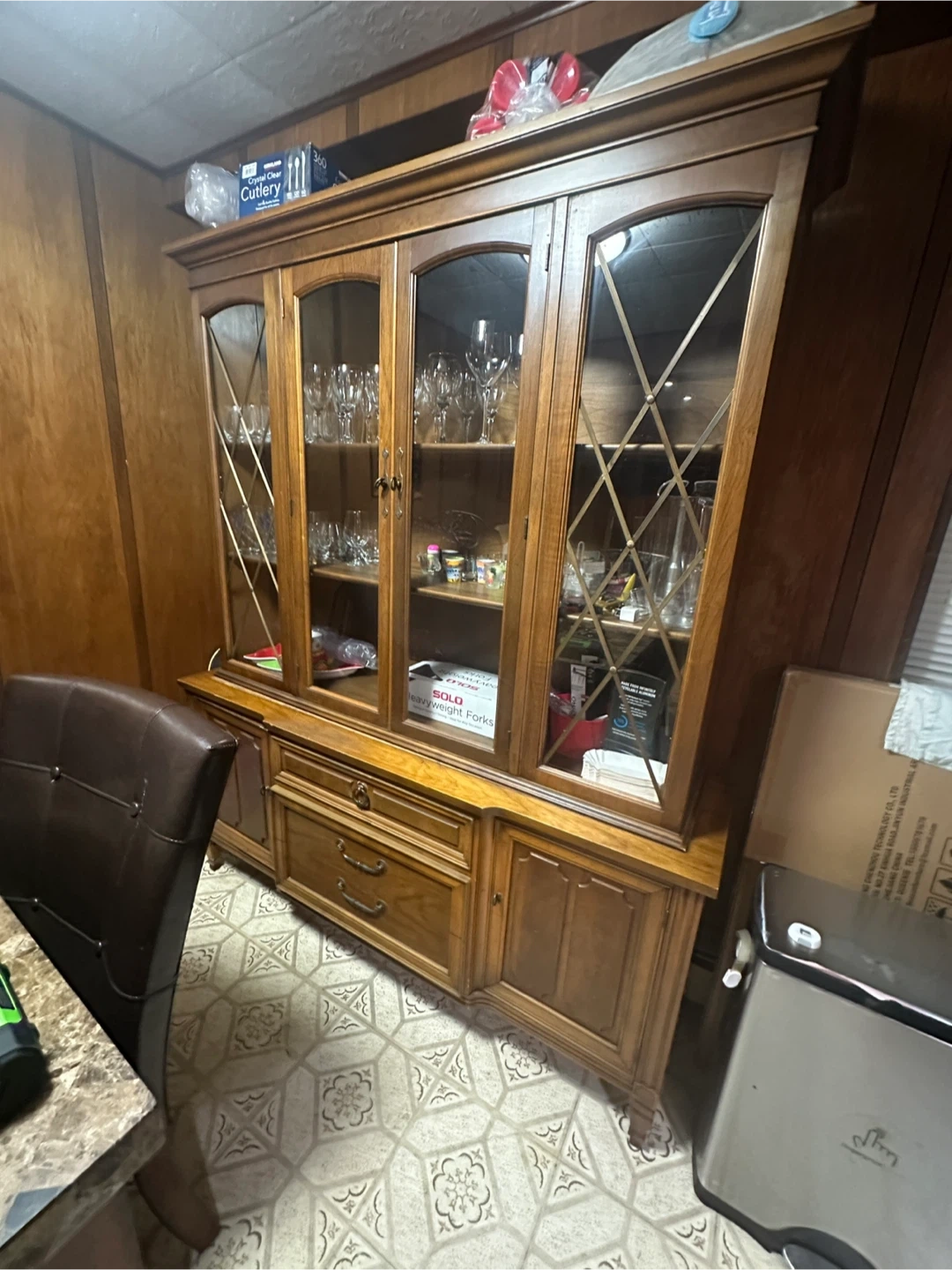 Selling a wooden china cabinet in good condition. It has glass doors and shelves for displaying your favorite items. The cabinet also features drawers for storage. It's a great piece to add to your dining room or living room