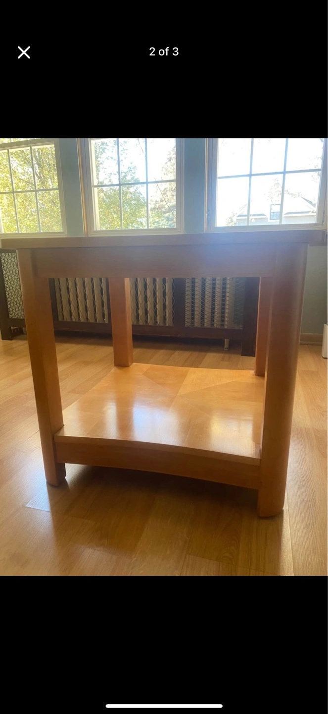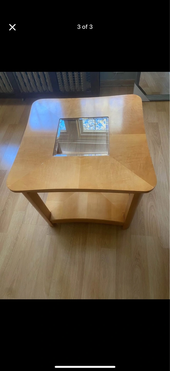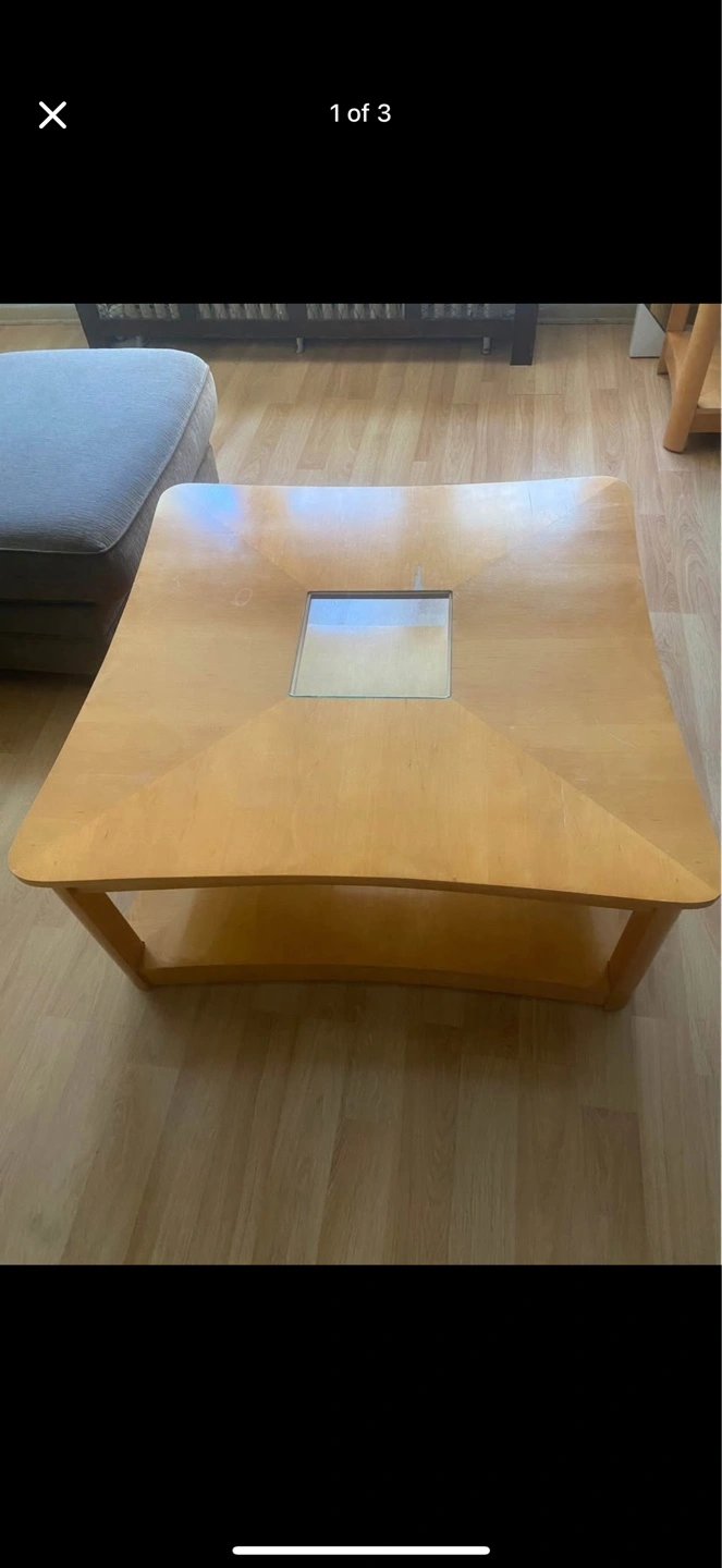 Square coffee table with a light wood finish. Includes a shelf underneath. Center of the table has a glass insert. A perfect place to enjoy a warm cup of tea after a long day. 3 coffee tables for sale. $50 for all three!!! NEED THEM GONE!