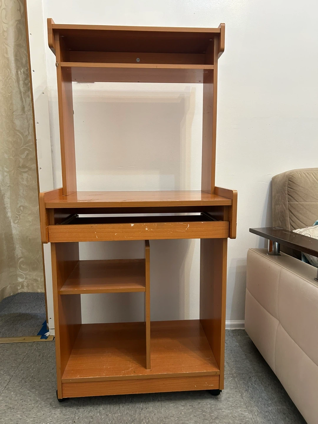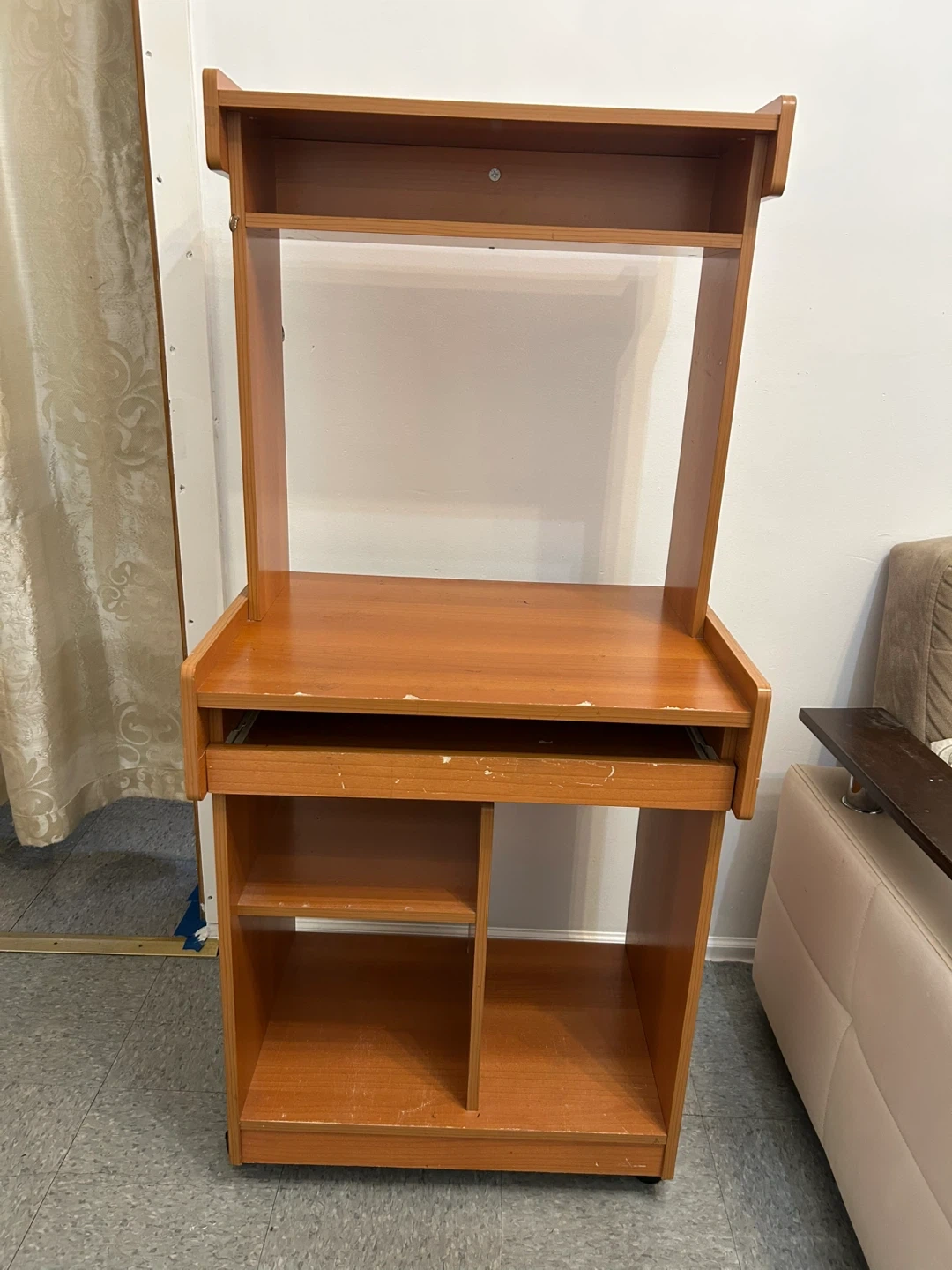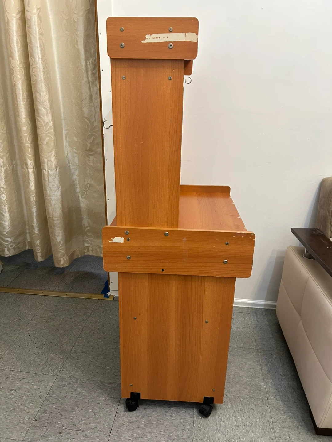 Selling a wooden computer desk with a hutch. It has some signs of wear and tear, as you can see in the photos, but other than that it is good, it also has wheels that slides easily. Great for a small workspace or student room, you can see the dimensions on the last picture
