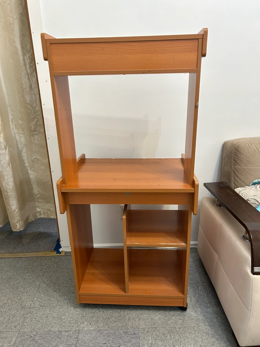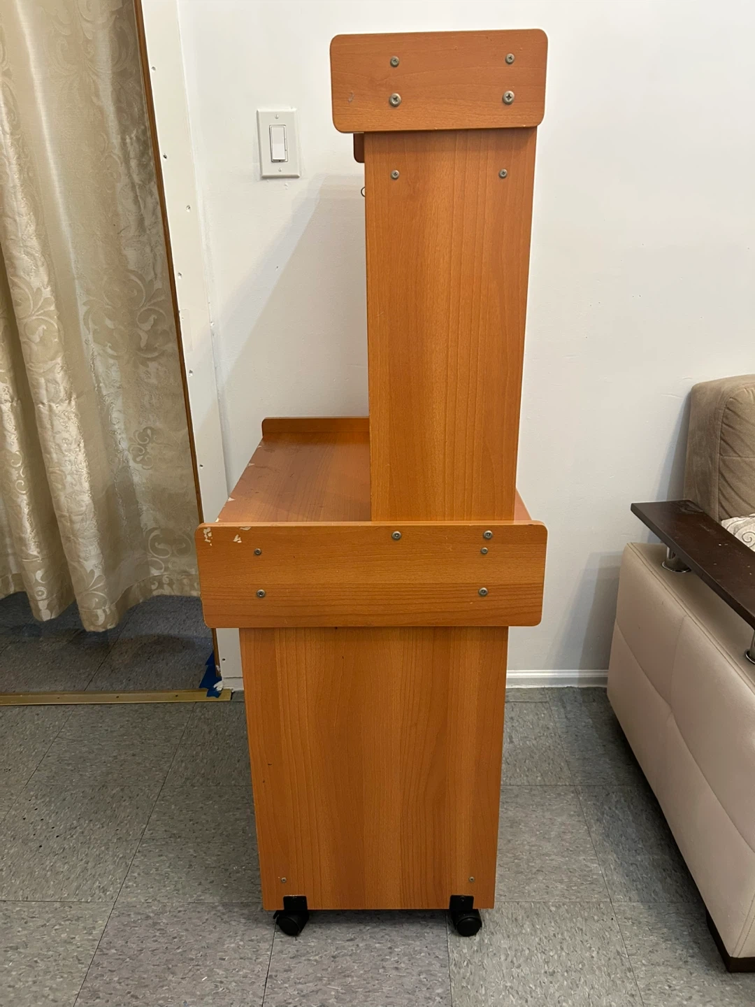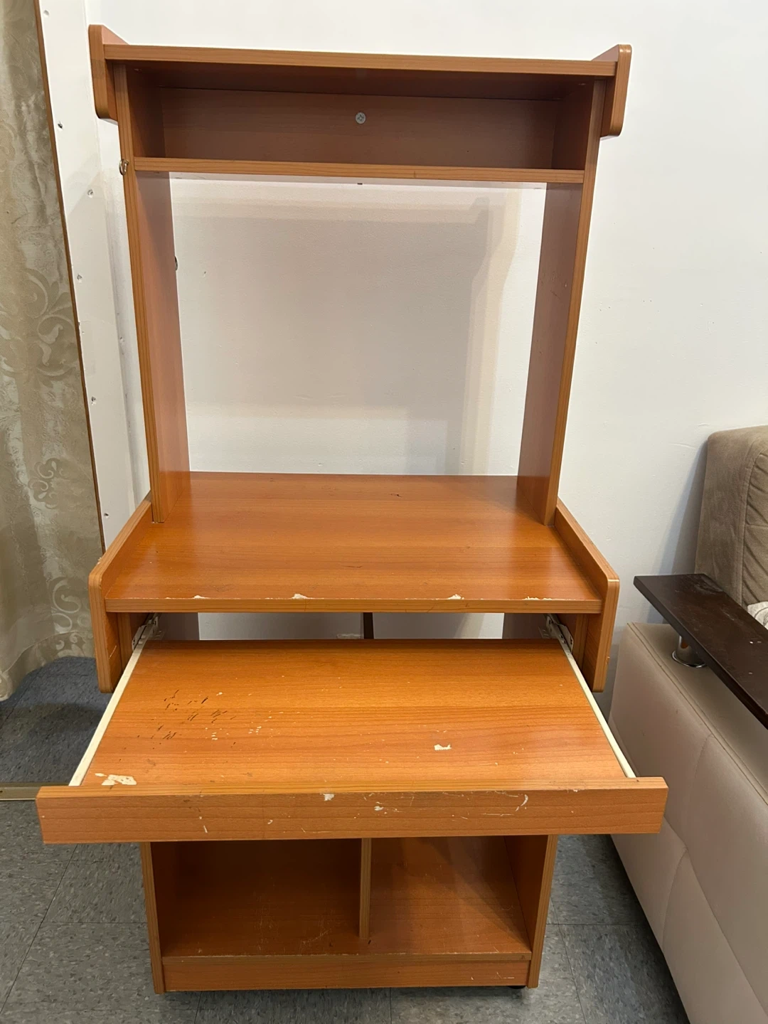 Selling a wooden computer desk with a hutch. It has some signs of wear and tear, as you can see in the photos, but other than that it is good, it also has wheels that slides easily. Great for a small workspace or student room, you can see the dimensions on the last picture