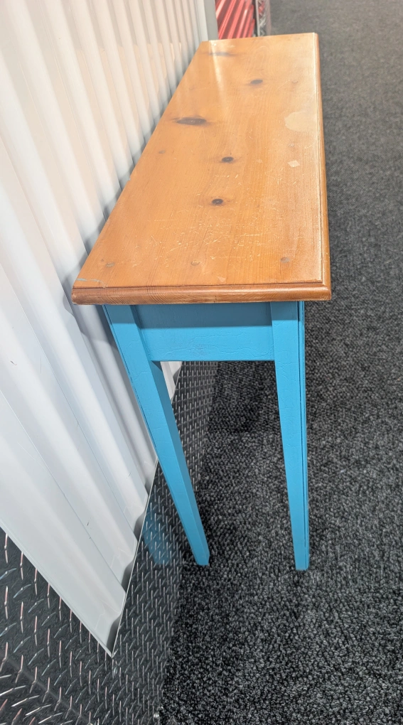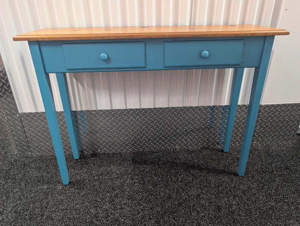 Selling a wooden console table with a natural wood top and blue painted legs and drawer fronts. It would be a great addition to any entryway or living space! Width 40in Height 30in Depth 11in