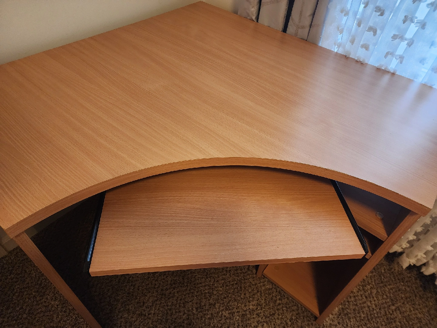 10This is a wooden corner desk, perfect for a home office or study space. It features a convenient keyboard tray to help maximize desk space. It's in good condition and ready for a new home!