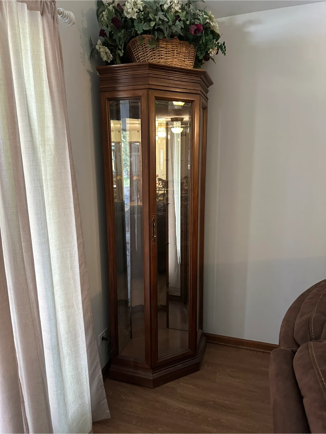 10Selling a wooden corner display cabinet with glass panels. It's in good condition and ready to showcase your favorite items