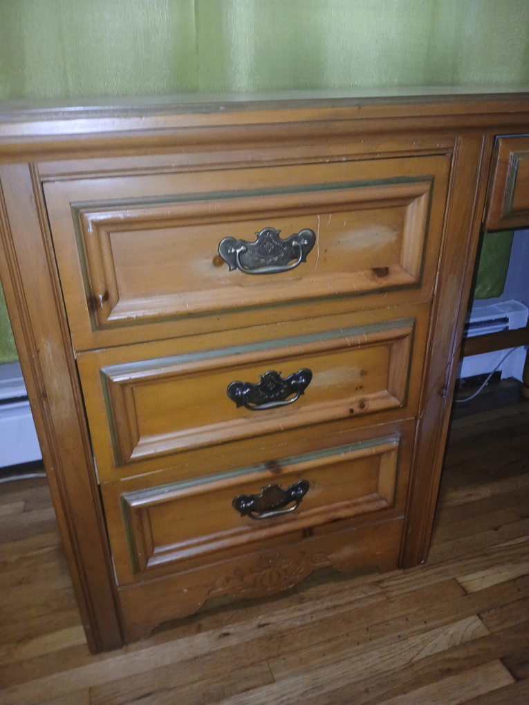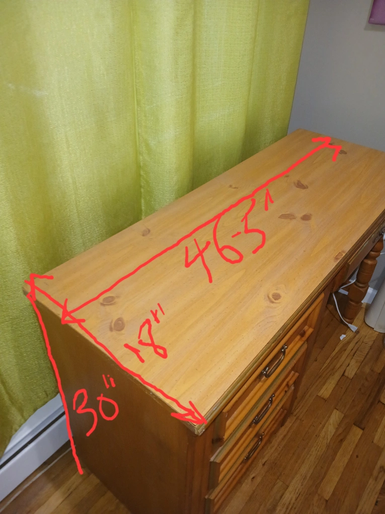 Selling a wooden desk with a classic design. It features a set of drawers on one side and a single drawer on the other. The desk measures approximately 46.5 inches in length, 18 inches in width, and 30 inches in height.