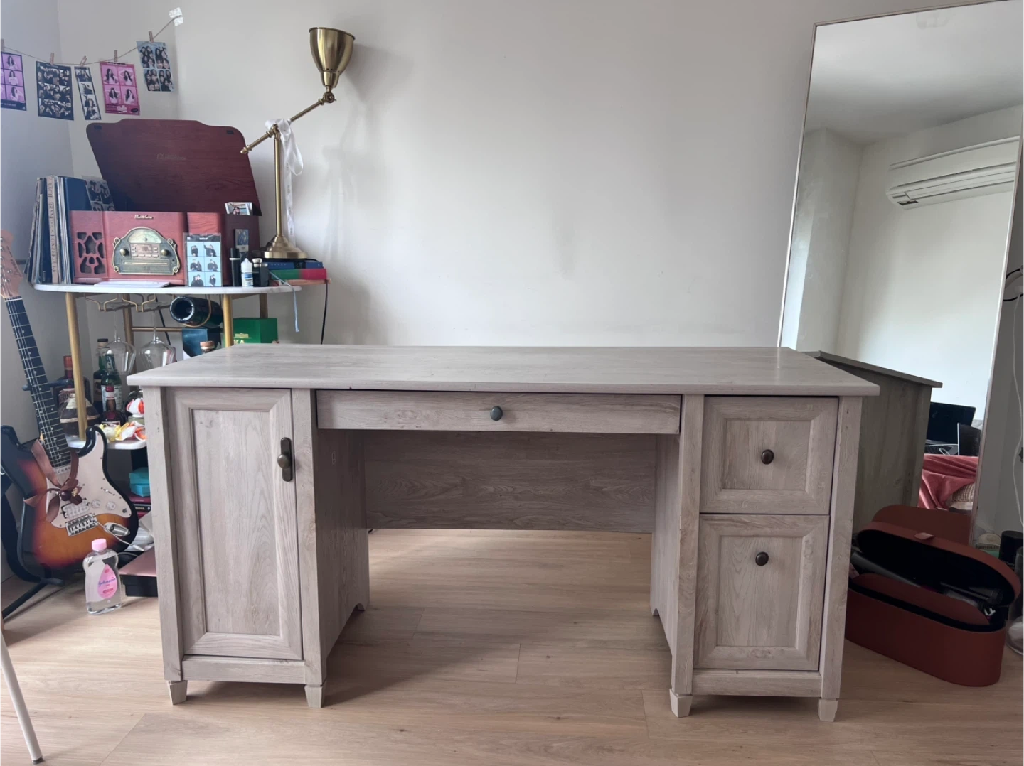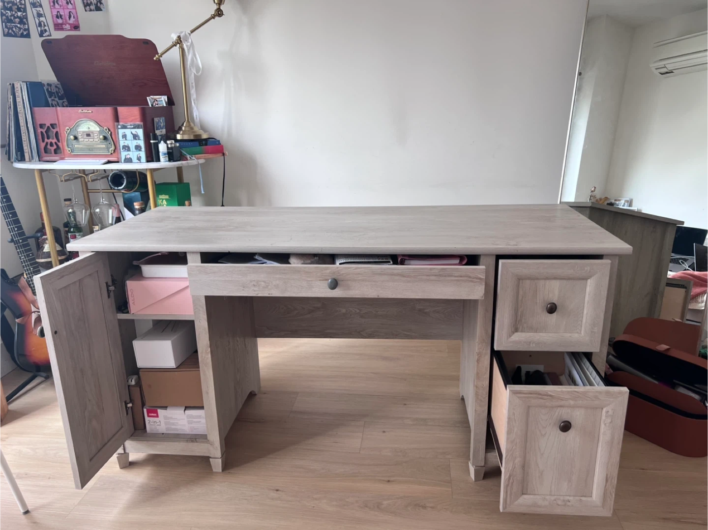 Selling a wooden desk that's perfect for a home office or study space! It features a drawer, a cabinet, and two additional drawers for plenty of storage. It's in great condition and ready for a new home