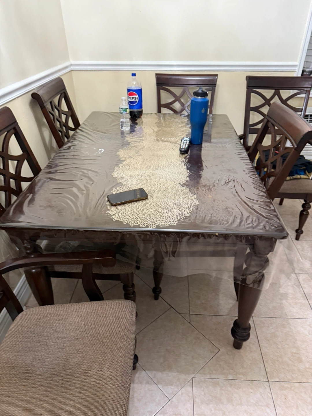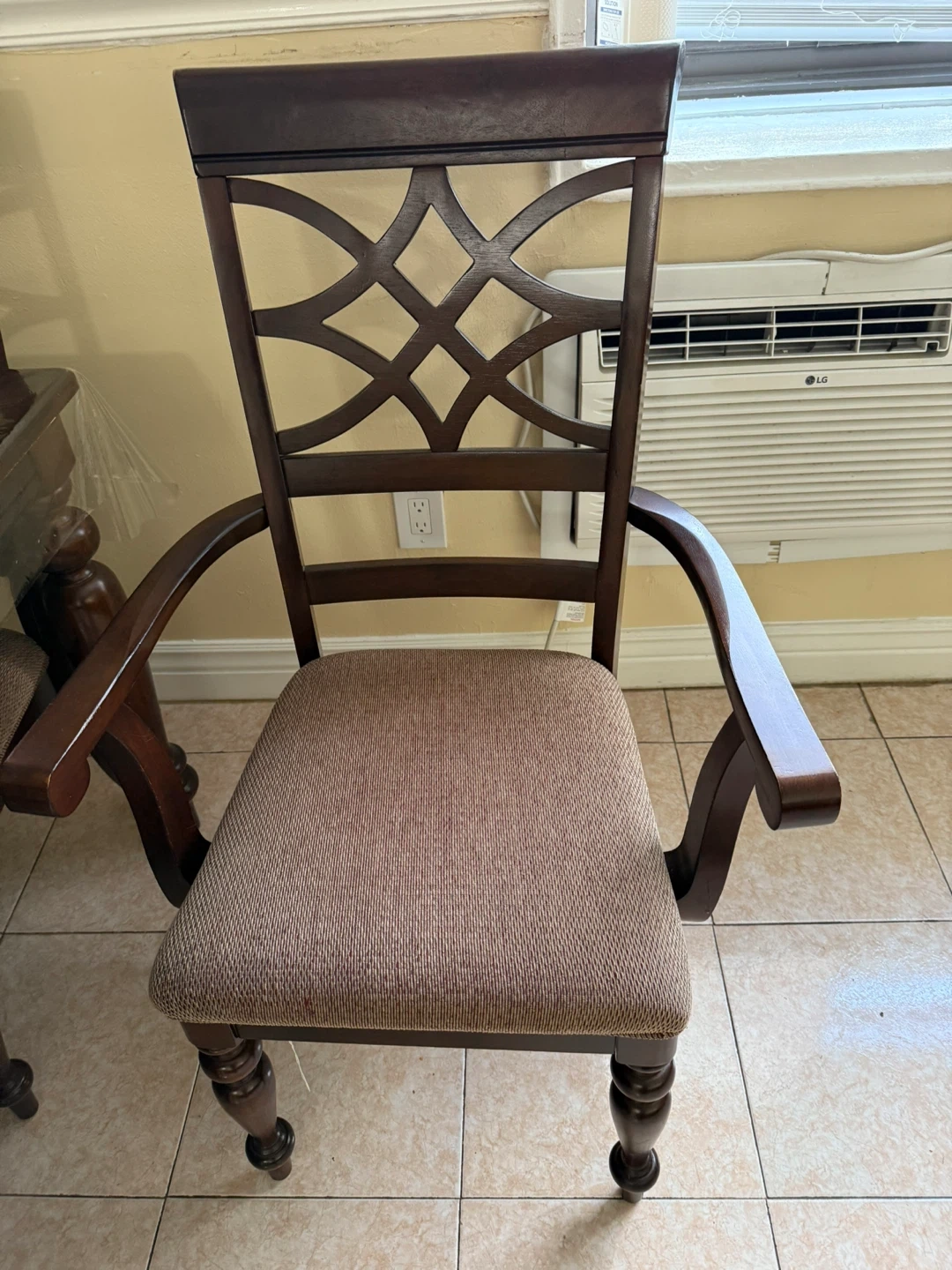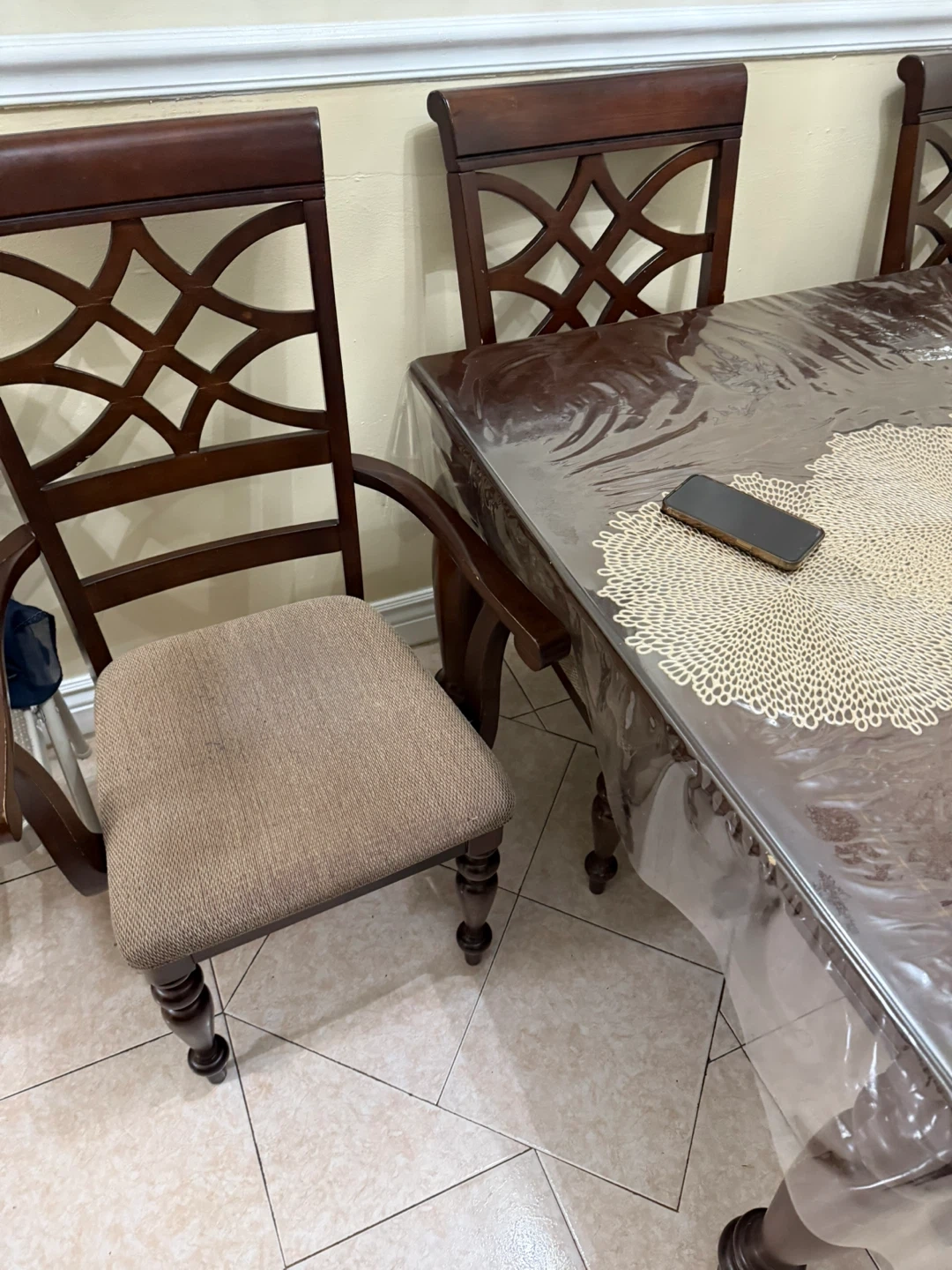 Selling a set of six wooden dining chairs. They have a classic design with a decorative back and sturdy construction. The seats are upholstered in a neutral fabric. Great for adding a touch of elegance to your dining room