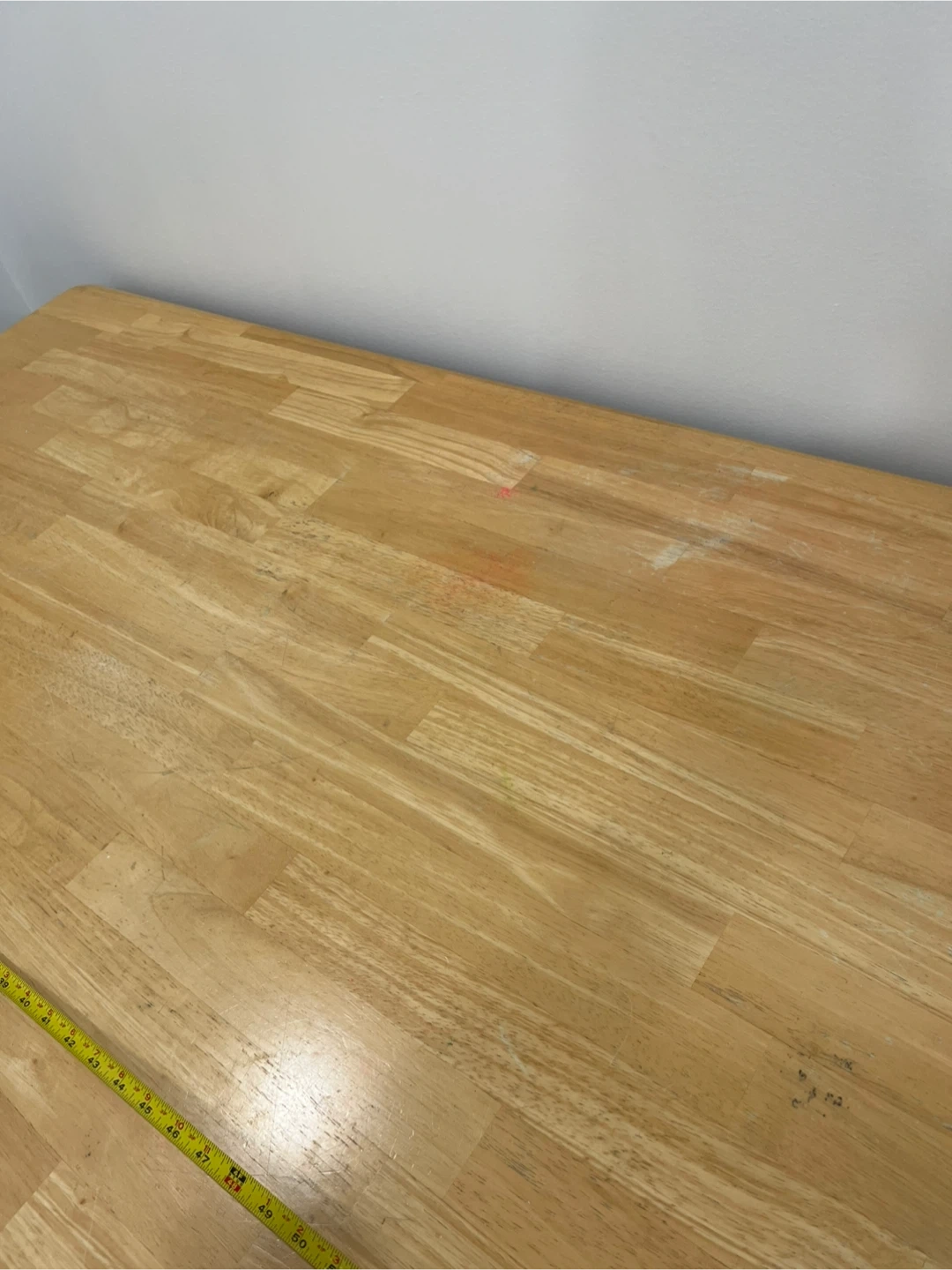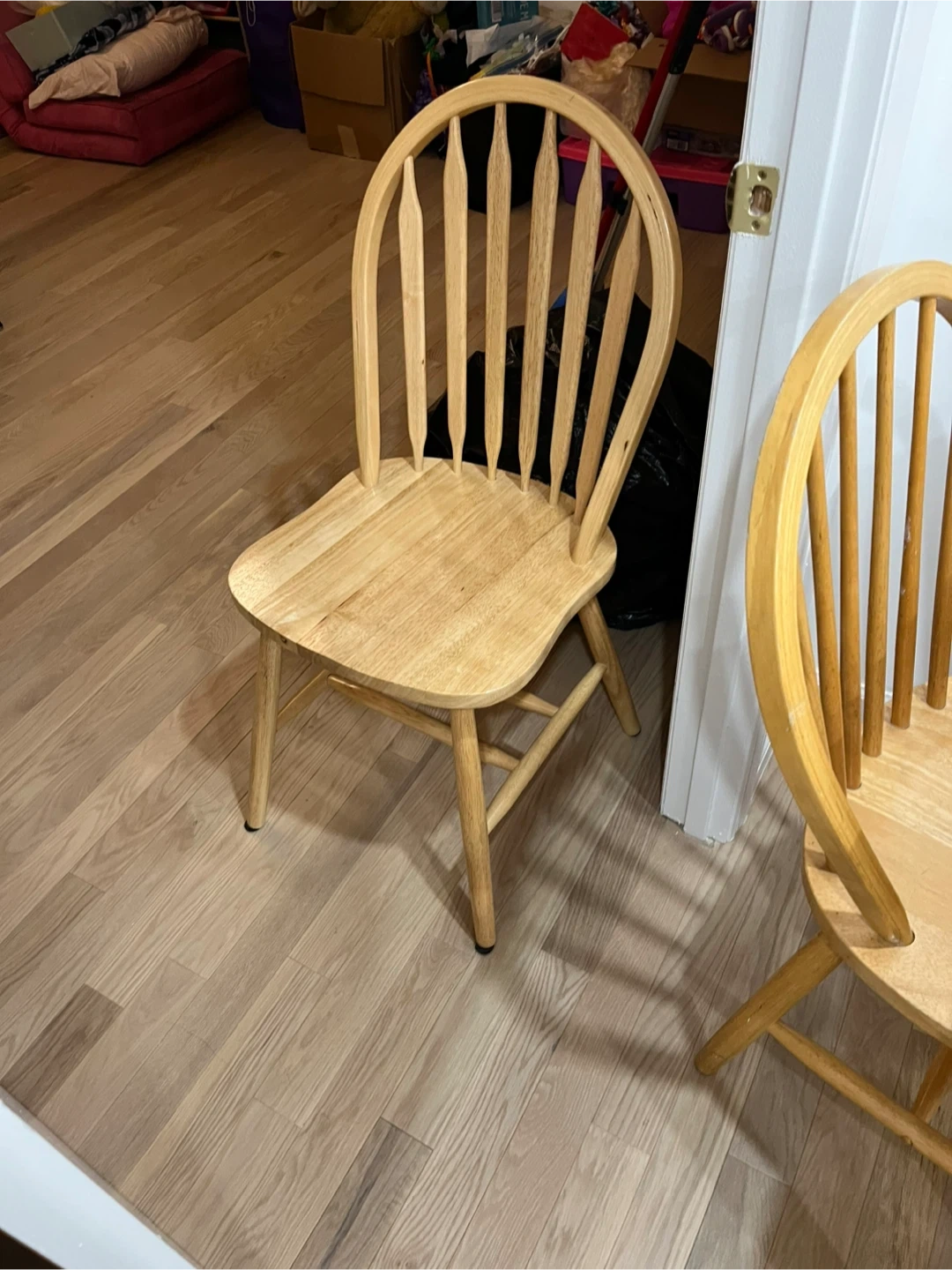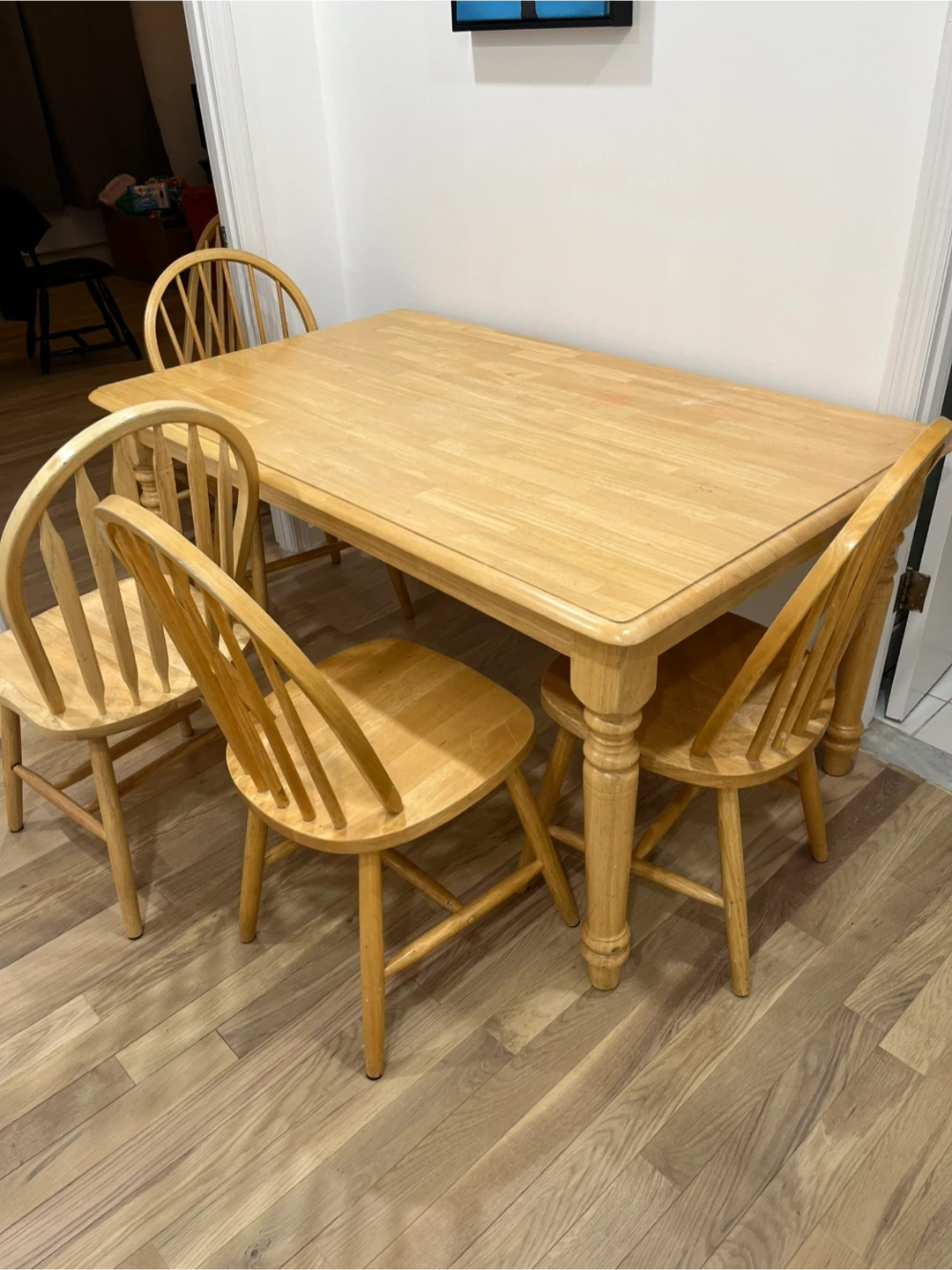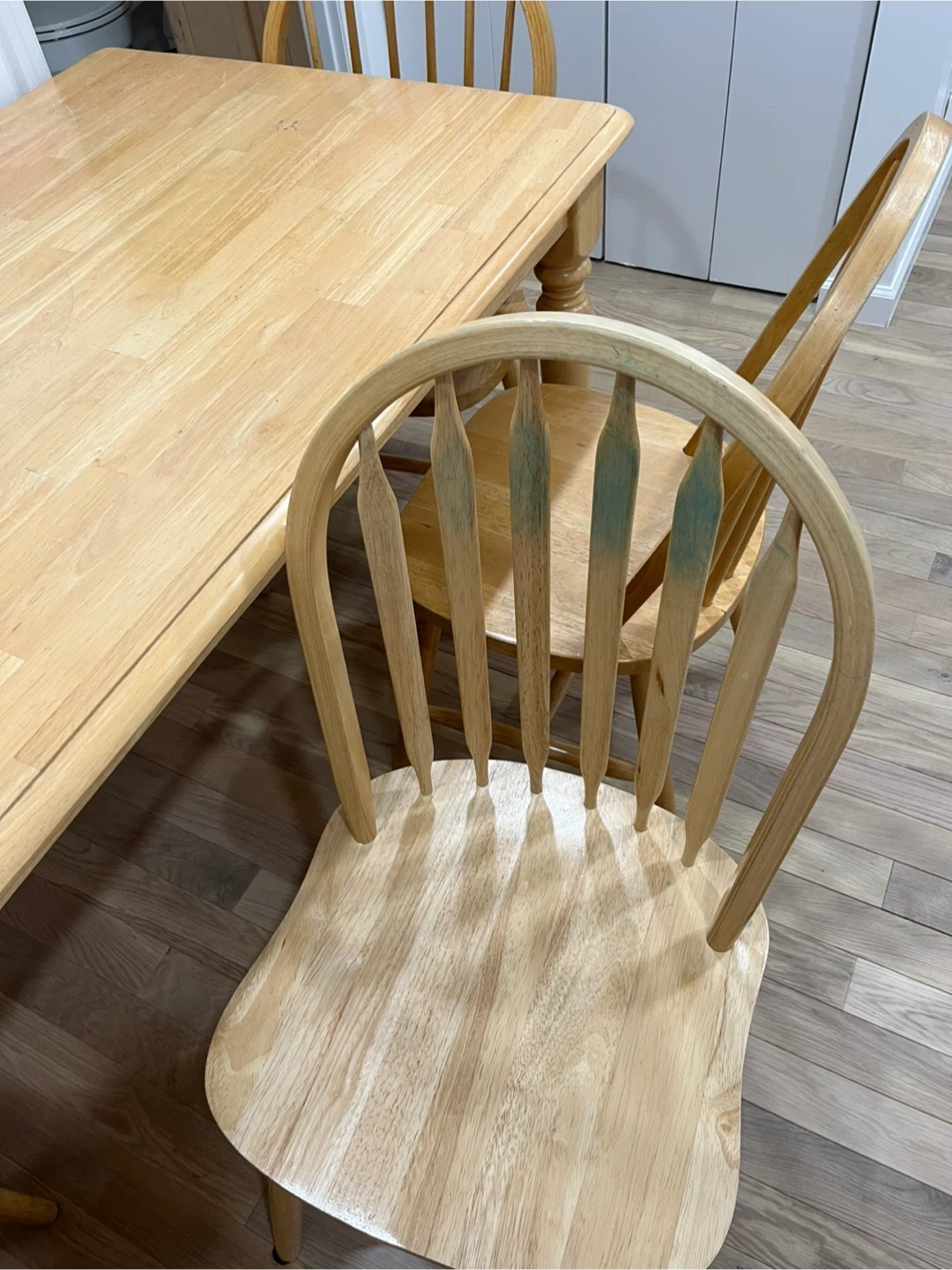 Selling a wooden dining table that comes with three to five matching chairs. The table measures approximately 60 inches in length and 36 inches in width. It's a great set for a family or anyone who enjoys hosting dinners! It comes with three original chairs and two other matching chairs. The additional chairs need to be either glued or screwed in to be considered usable. Up to the buyer if they want the additional chairs. Table does have some markings on it from a child. One of the additional chairs also has a blue tint from hair dye. Pick up only. Let me know if you have any questions. Thanks.