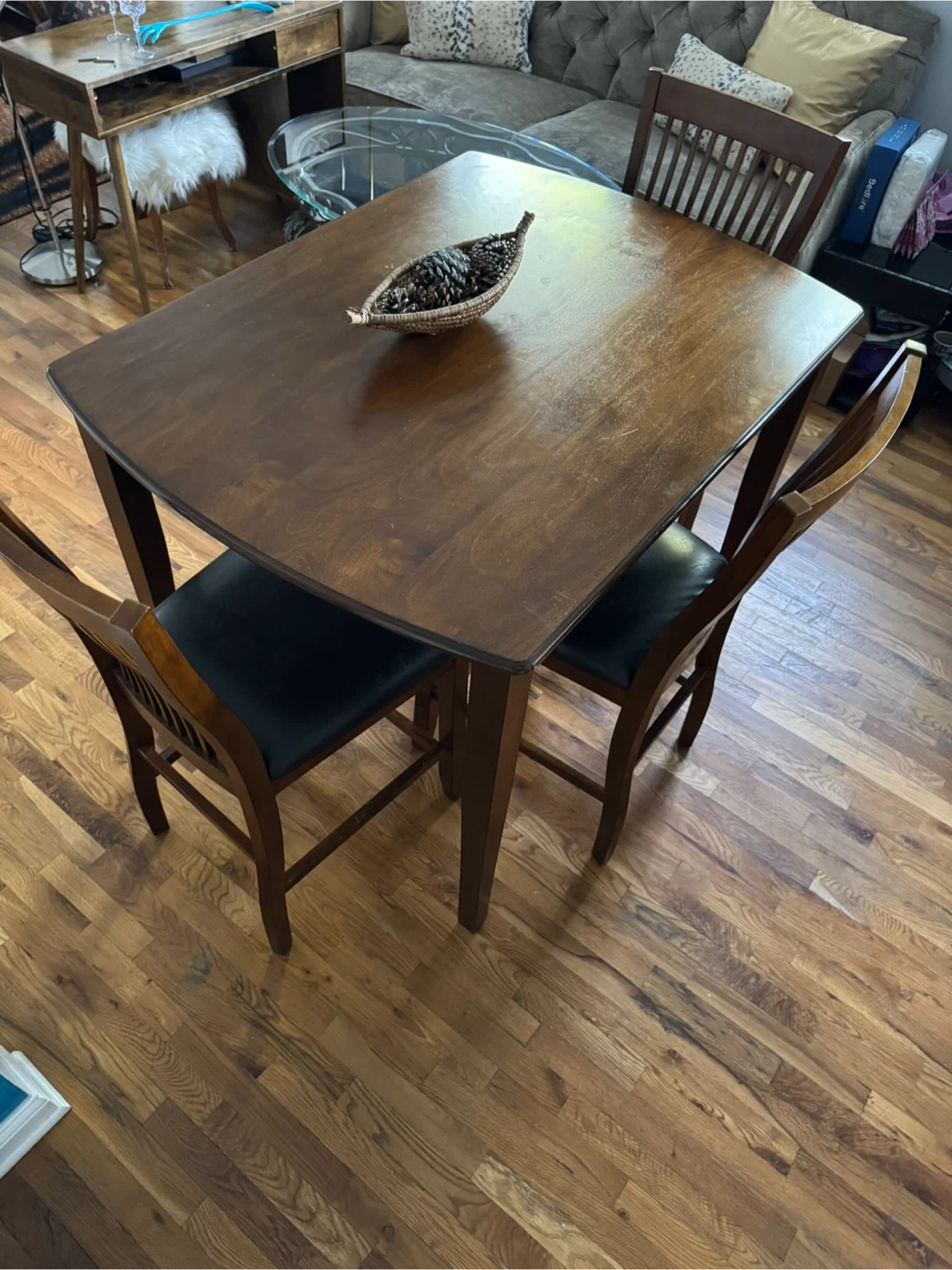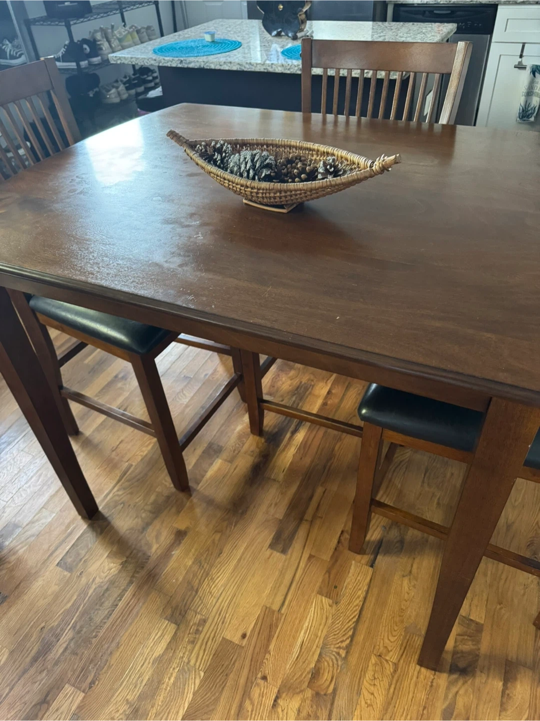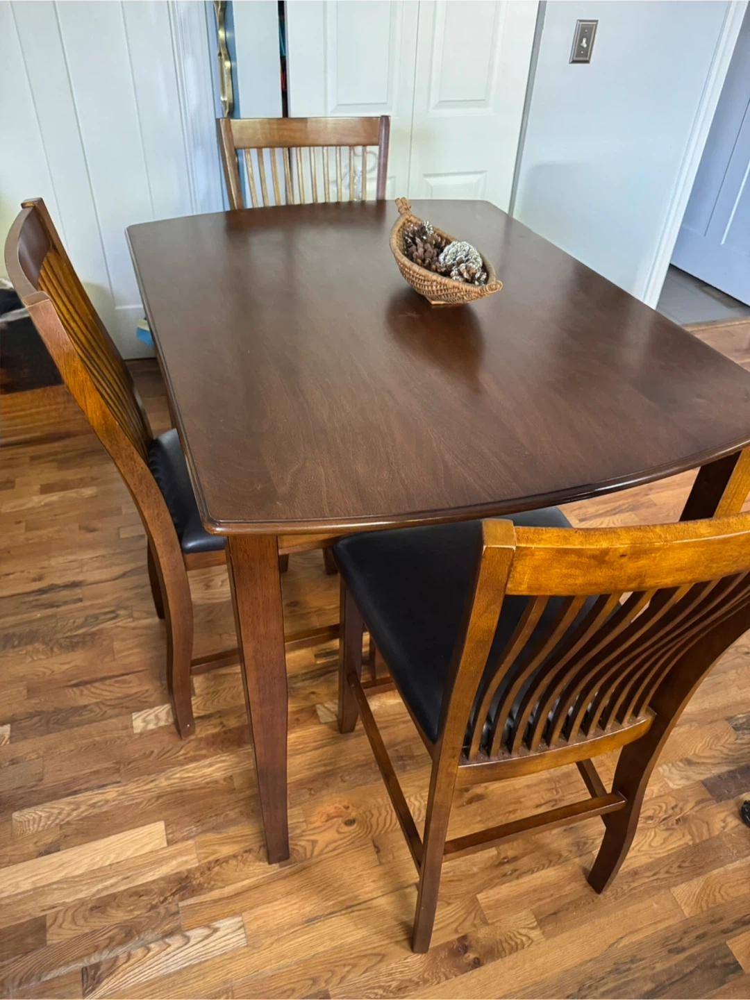 118Selling a wooden dining table that comes with four matching chairs. The set has a warm, inviting look and would be great for a kitchen or dining area. The chairs have brown faux leather padded seats for extra comfort. Perfect for family meals or entertaining guests!