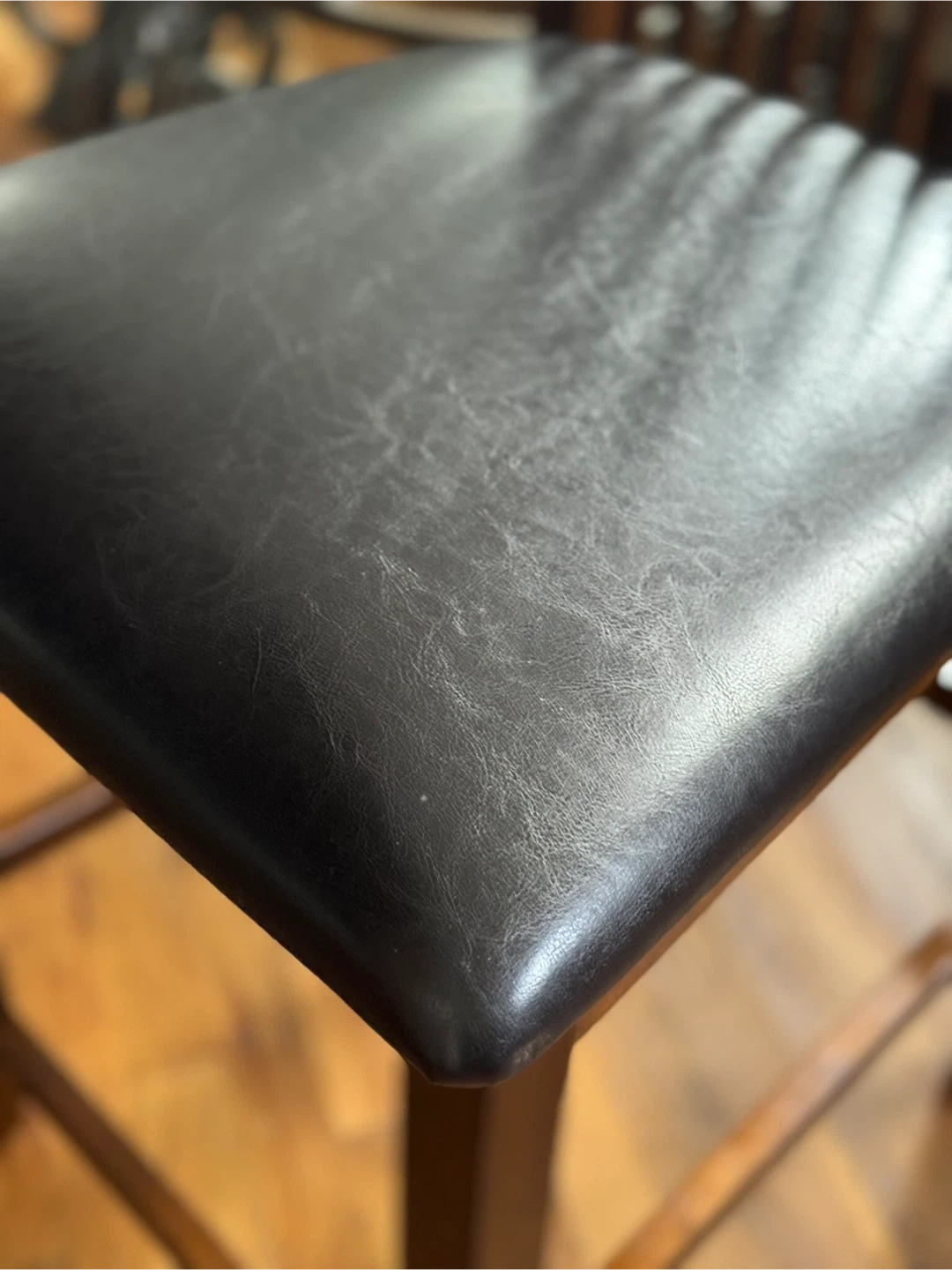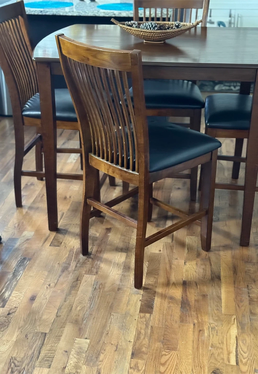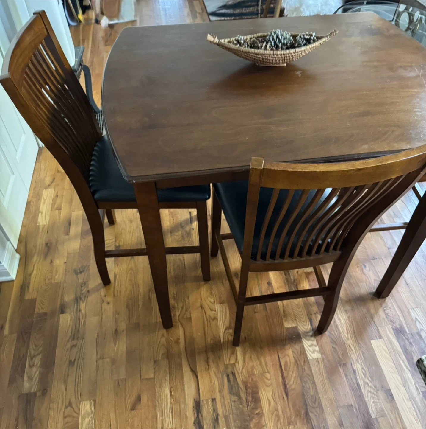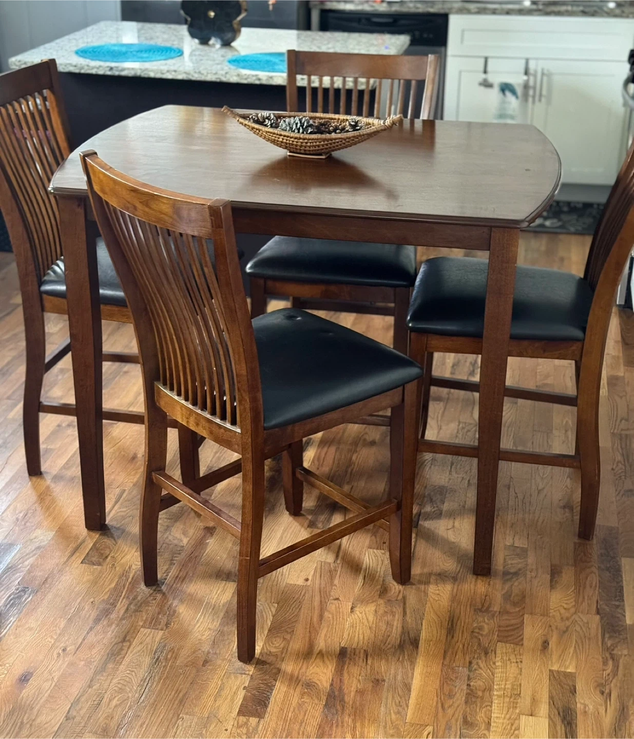 118Selling a wooden dining table that comes with four matching chairs. The set has a warm, inviting look and would be great for a kitchen or dining area. The chairs have brown faux leather padded seats for extra comfort. Perfect for family meals or entertaining guests!