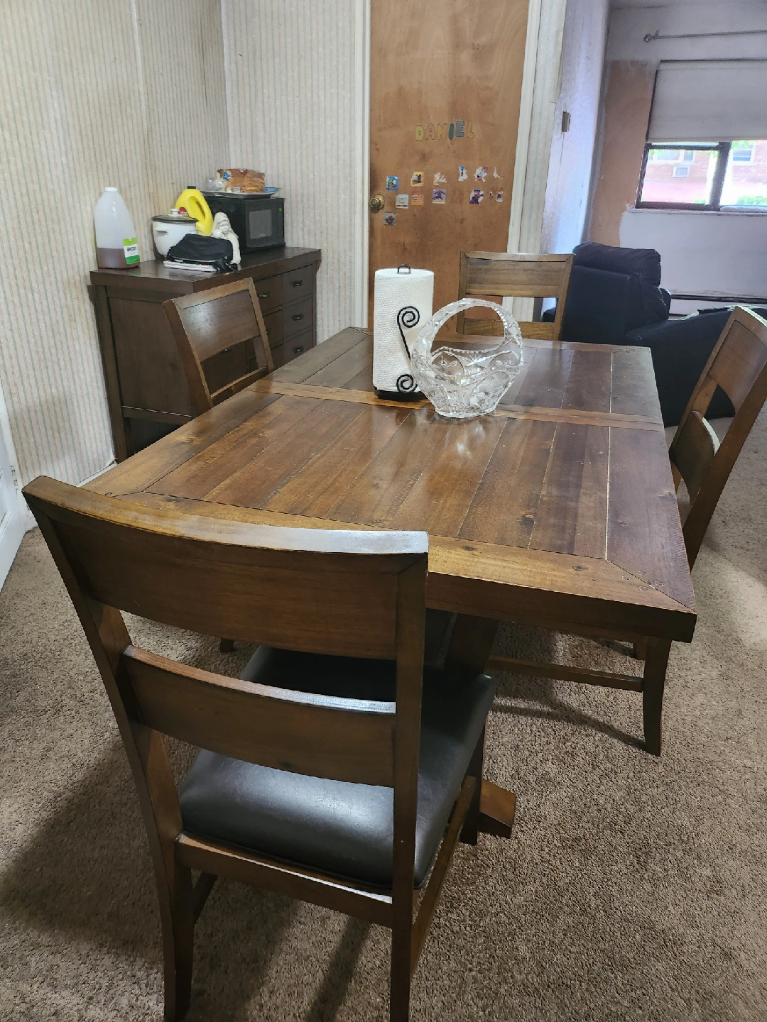 ( Deal $ ) Selling a wooden dining table with four chairs. It's in good condition and ready for a new home. The chairs have dark cushioned seats. Condition : 4/5 ☆☆☆☆