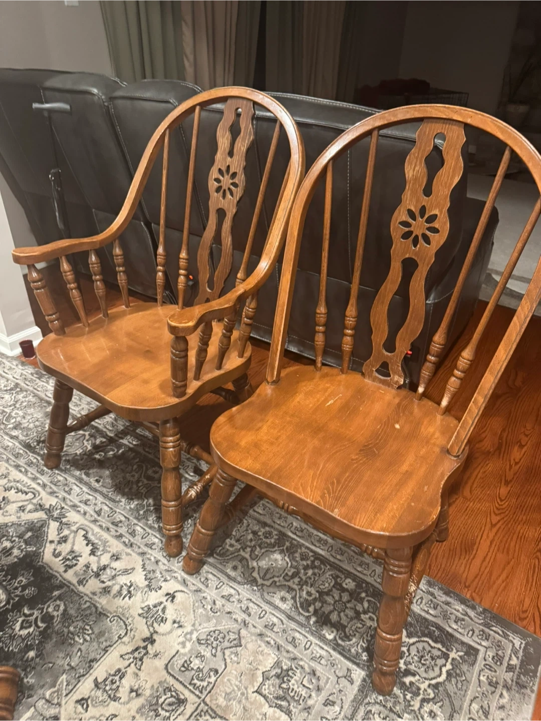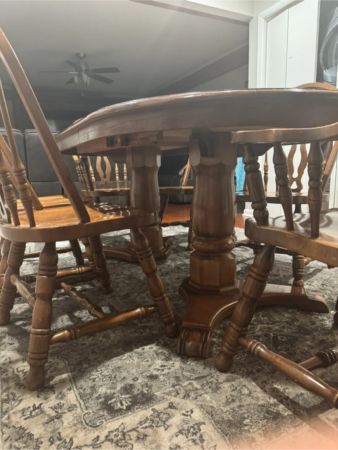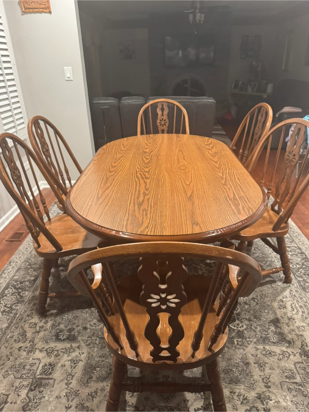 10Solid wood dining table in excellent condition was always covered! Beautiful solid oak base. Table is extendable 60 by 42 And 74 by 42 when extended 6 chairs are included but in good condition Willing to separate chairs and table Pick up in Willowbrook