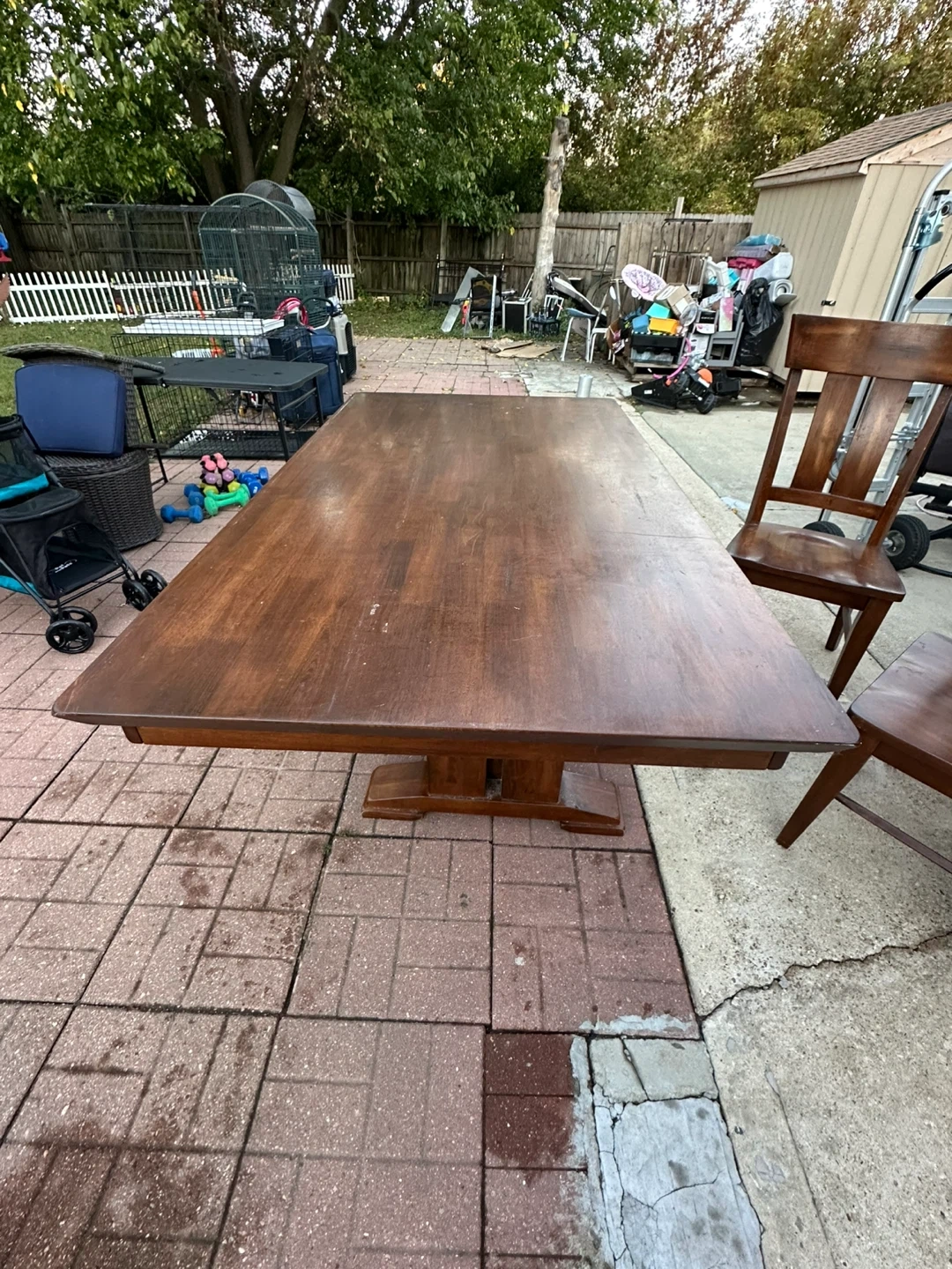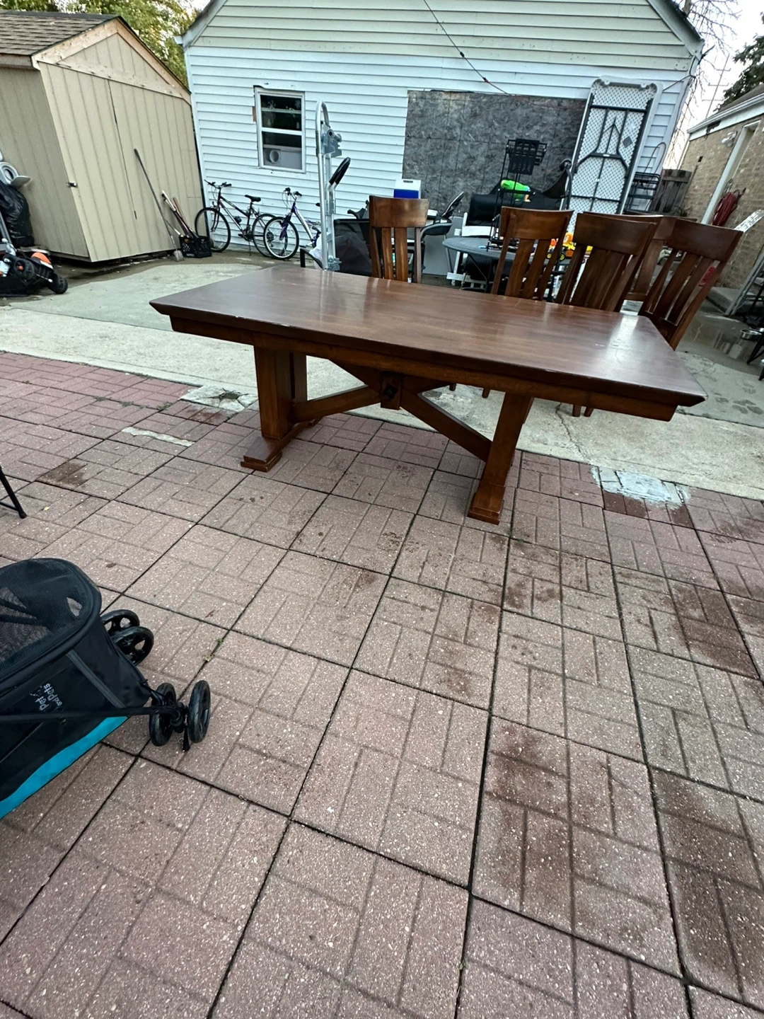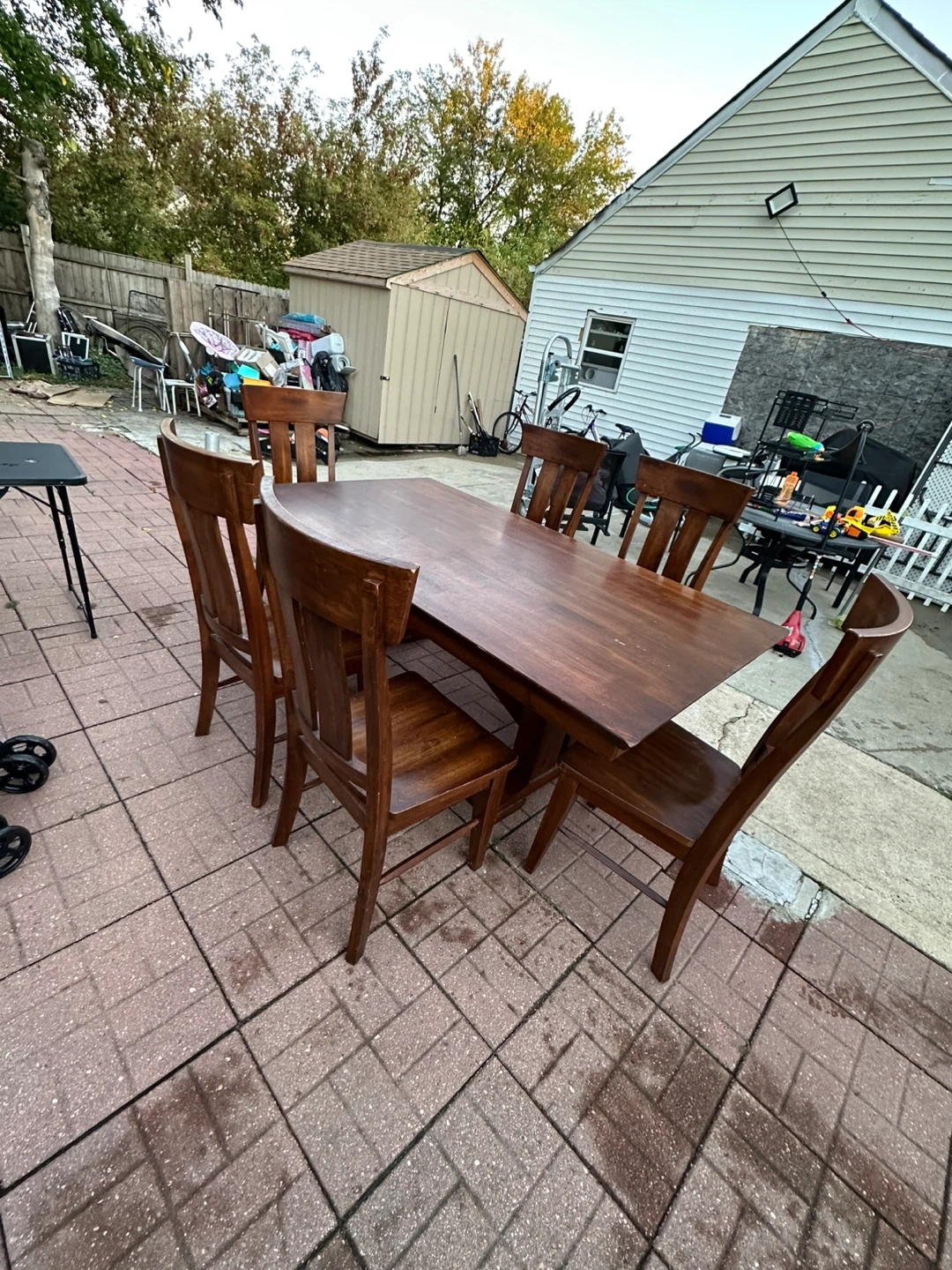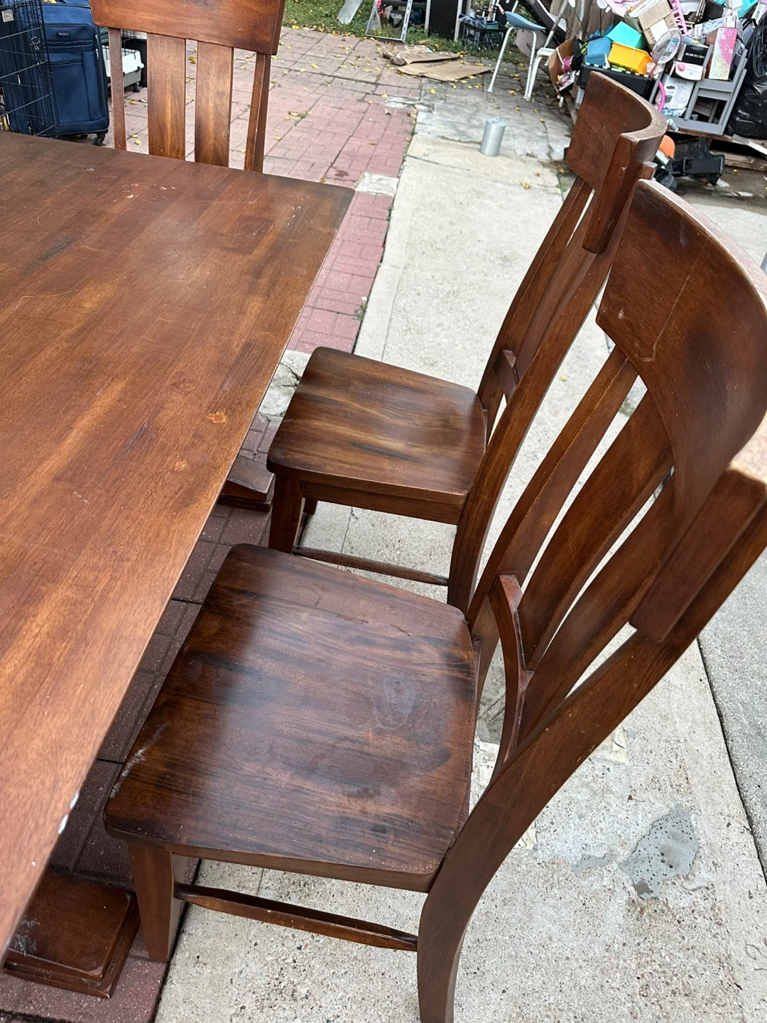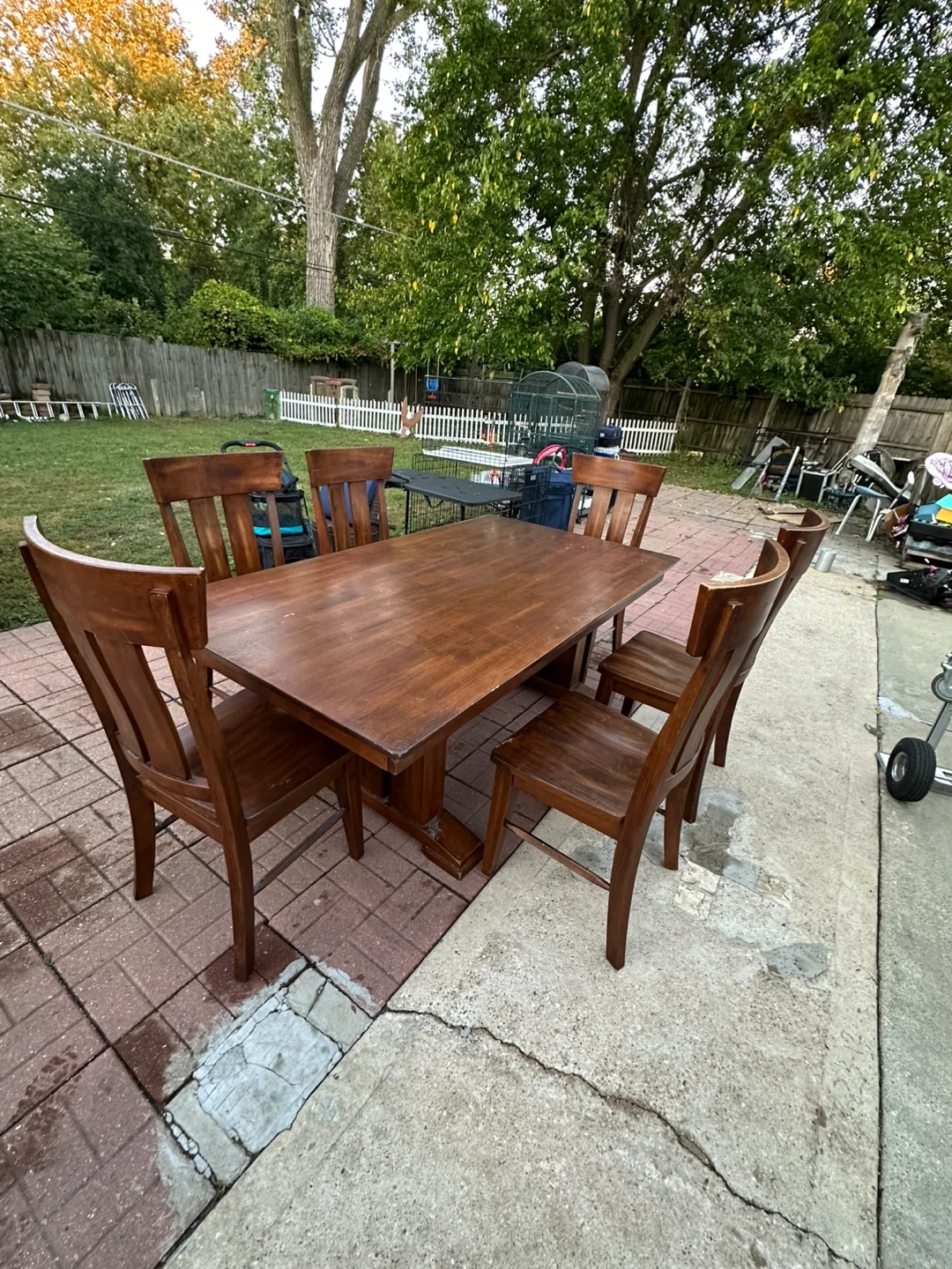 Selling a wooden dining table that comes with six chairs. It's a great set for family dinners or gatherings with friends. The table and chairs have a classic design and are made of sturdy wood. There are some signs of use, but overall it's in good condition and ready for a new home!