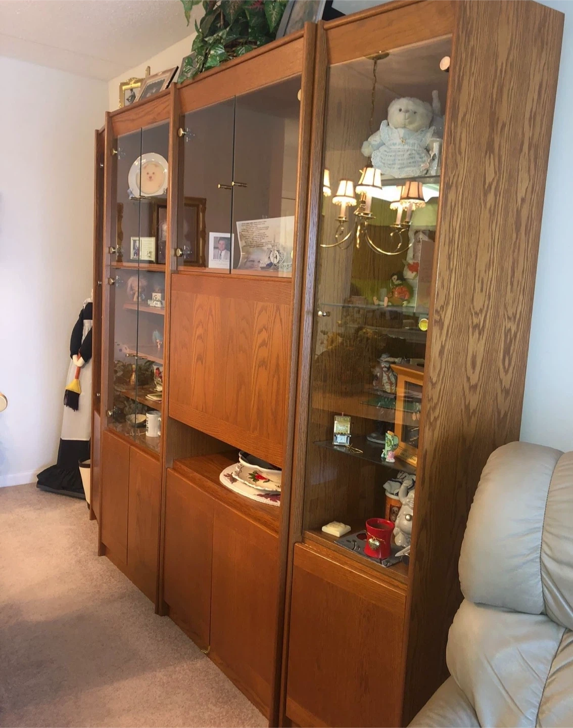 65Selling a wooden display cabinet with glass doors. It has a classic design and offers ample storage space for displaying your favorite items. The cabinet are in good condition and would be a great addition to any living room or dining area