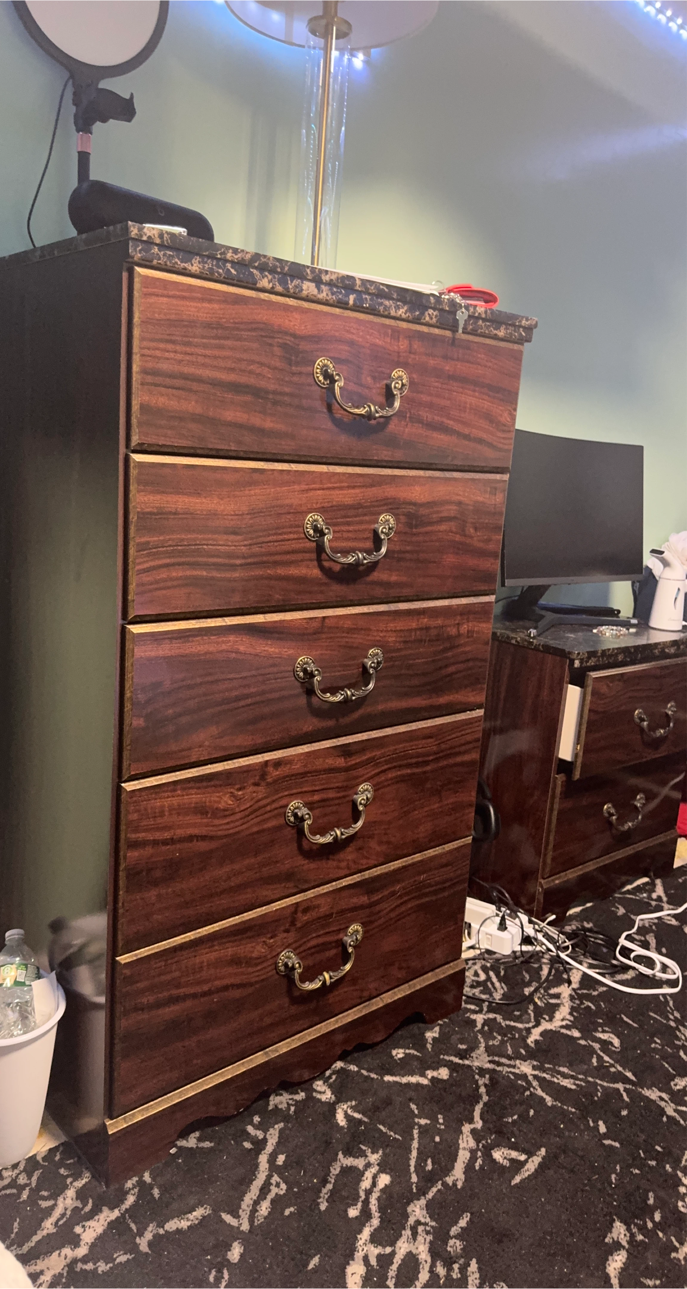 Selling a wooden dresser with five drawers. It features a marble-like top and ornate metal handles. A matching smaller dresser is available as well!