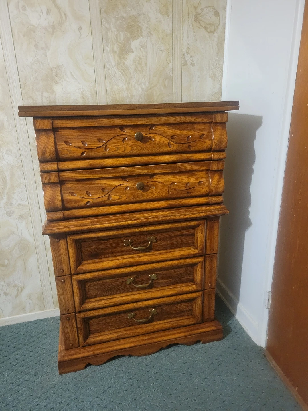 65Selling a wooden dresser with a unique leaf design on the top drawers. It has a warm, classic look and offers plenty of storage with its multiple drawers. Perfect for adding a touch of elegance to any bedroom!