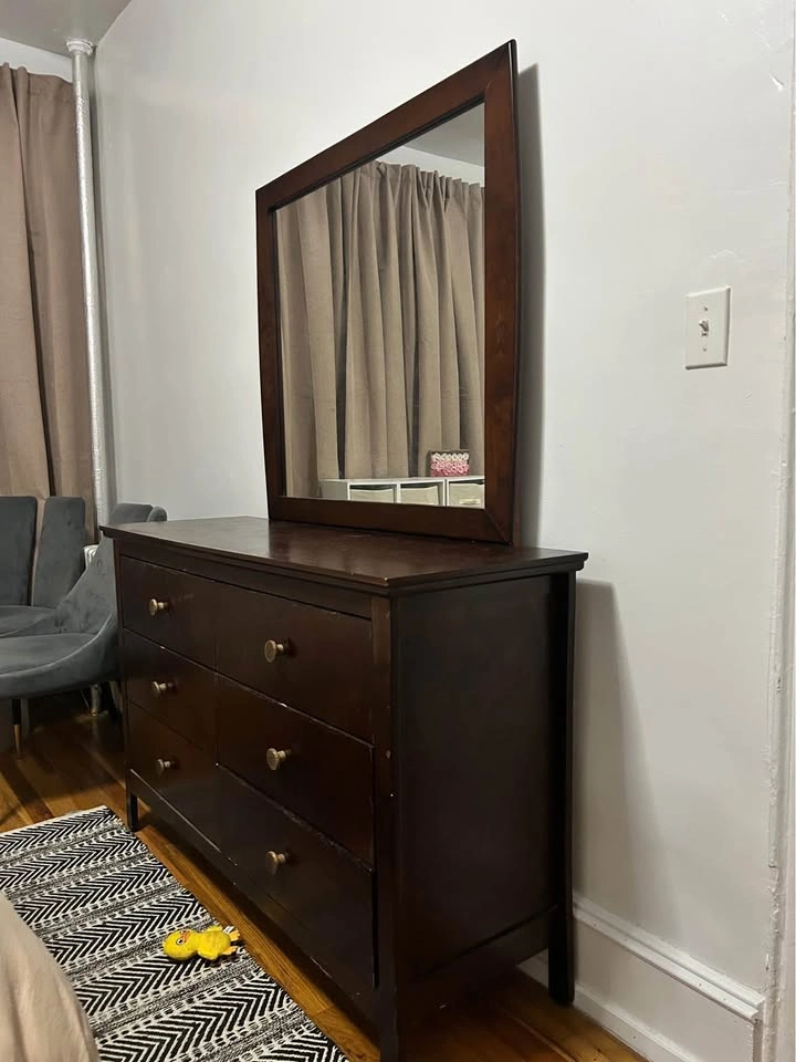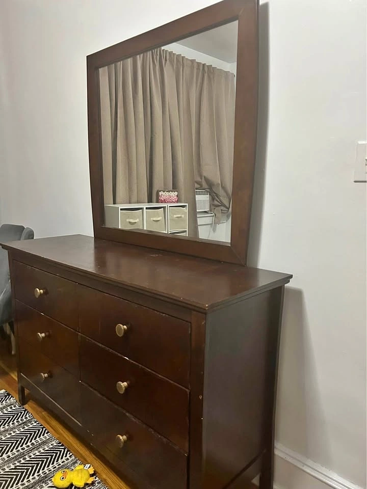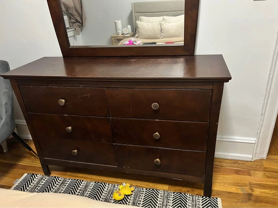 Classic dark wood dresser with matching mirror. 6 spacious drawers – smooth open/close. Sturdy and solid construction. Mirror included (removable if needed). Great for bedroom, guest room, or entryway. Has normal wear (minor scratches/marks, shown in photos/video no), but nothing that affects use. Drawers are clean and ready for storage. Pickup Only near Target 225th, Bronx 10463 – I can help load into your vehicle.