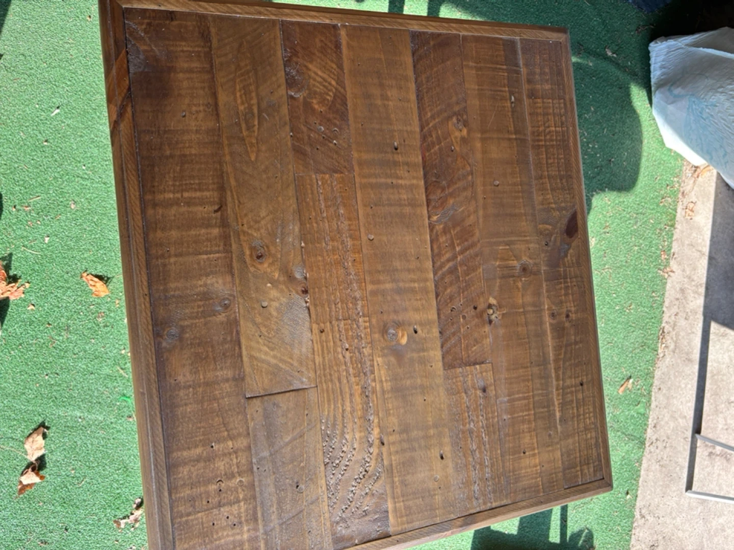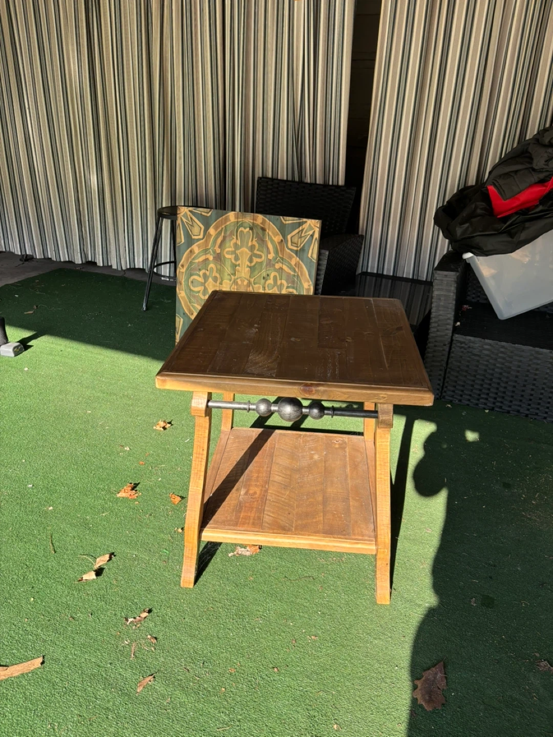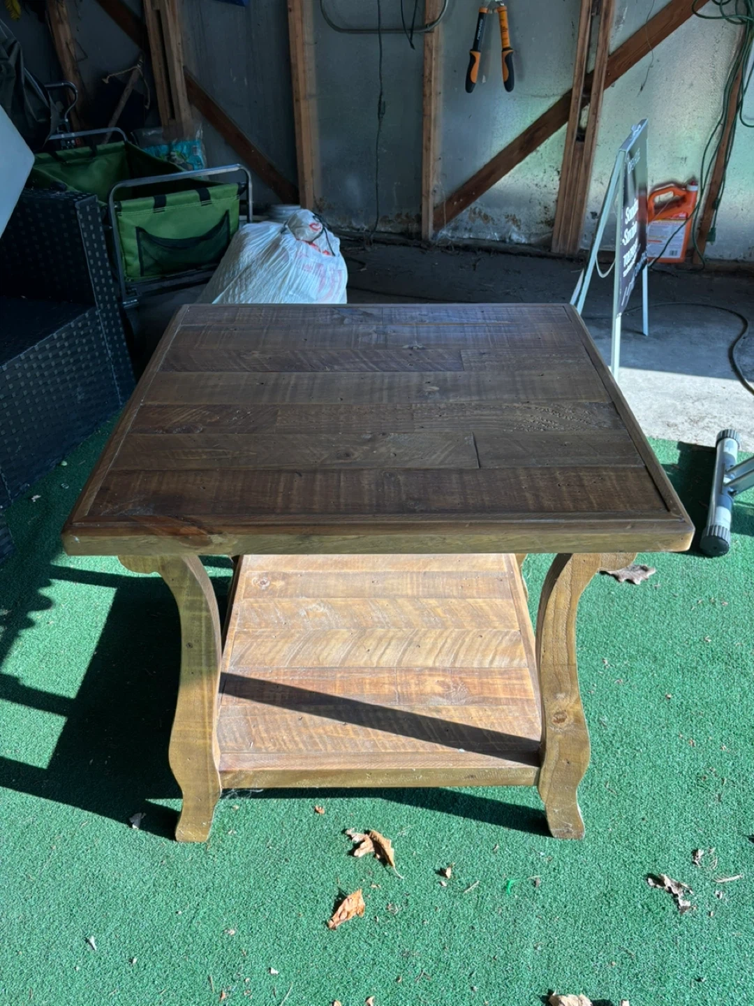 10Selling a wooden end table. It has a rustic look and would fit well in a living room or bedroom. It features a lower shelf for storage or display. It's in good condition only been used in storage
