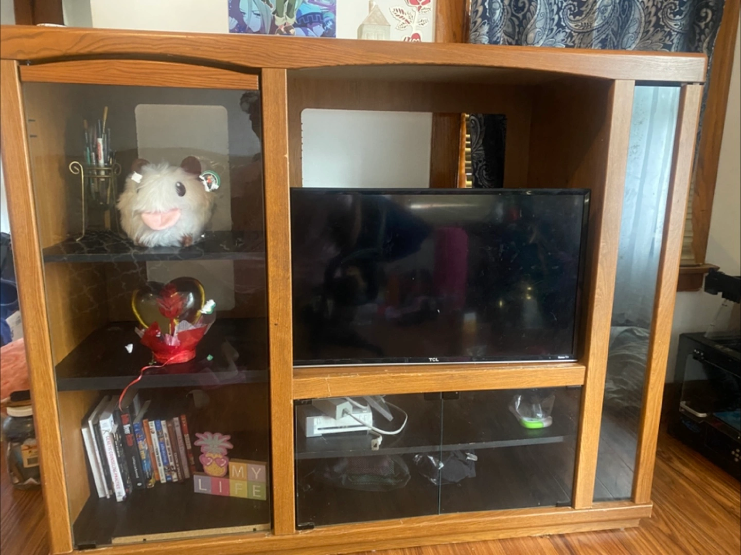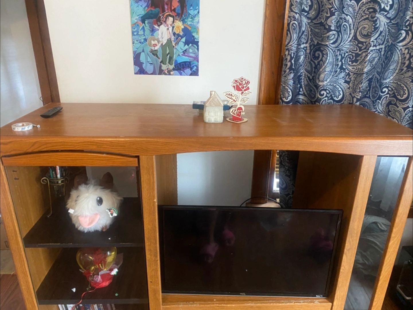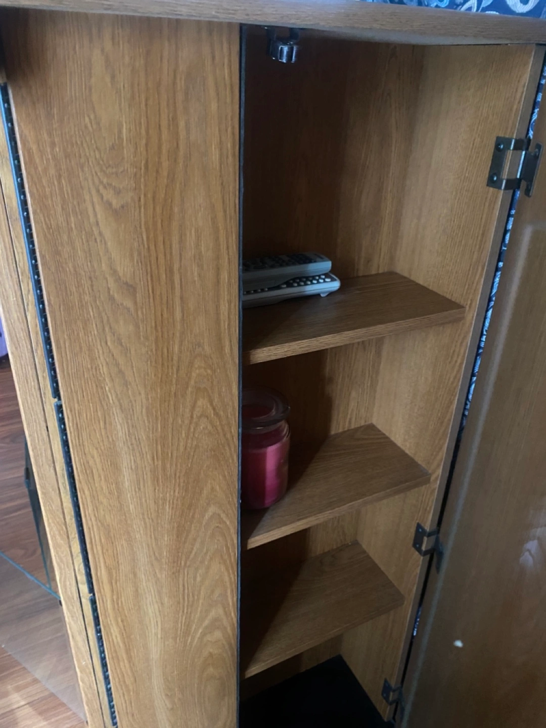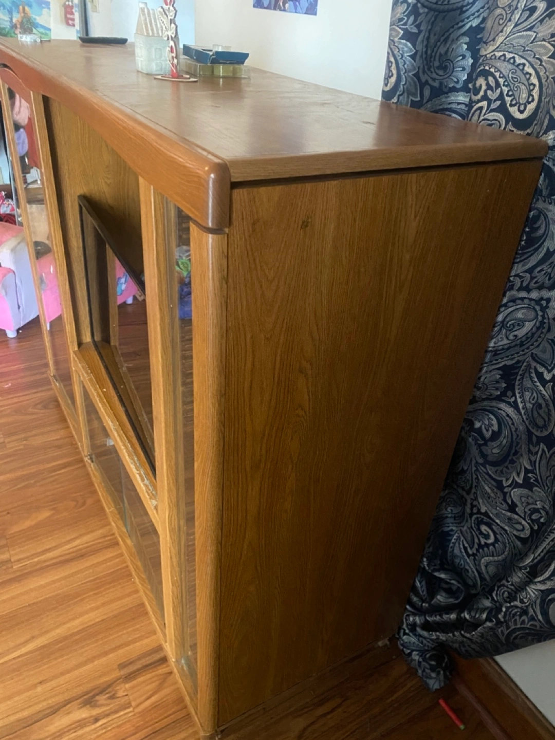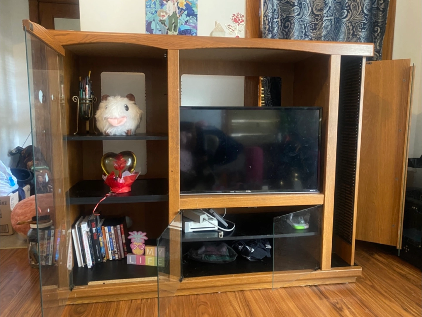 Selling a wooden entertainment center! It has glass doors on the front and shelves for storage. There's plenty of space for a TV and other media devices. Regular wear and tear marks and you have to lift the left door a bit to push it in. Other than that it's in good condition and ready for a new home