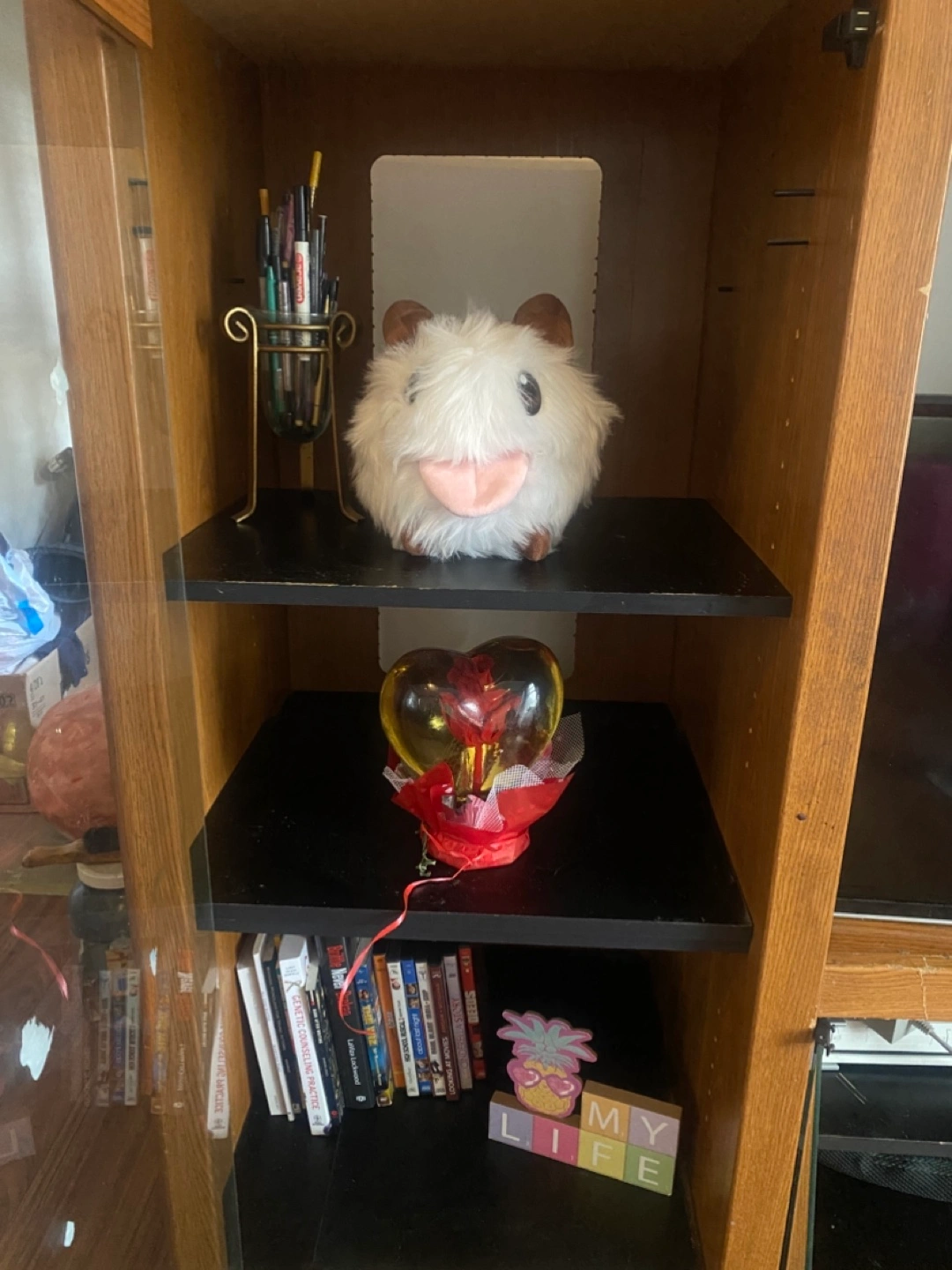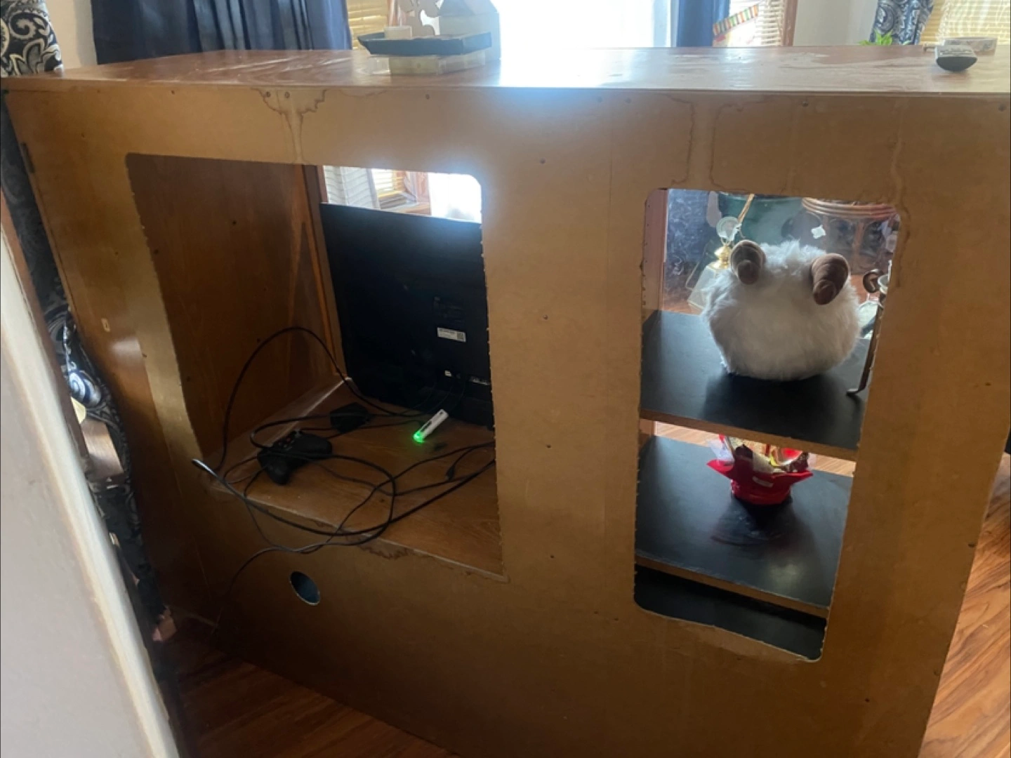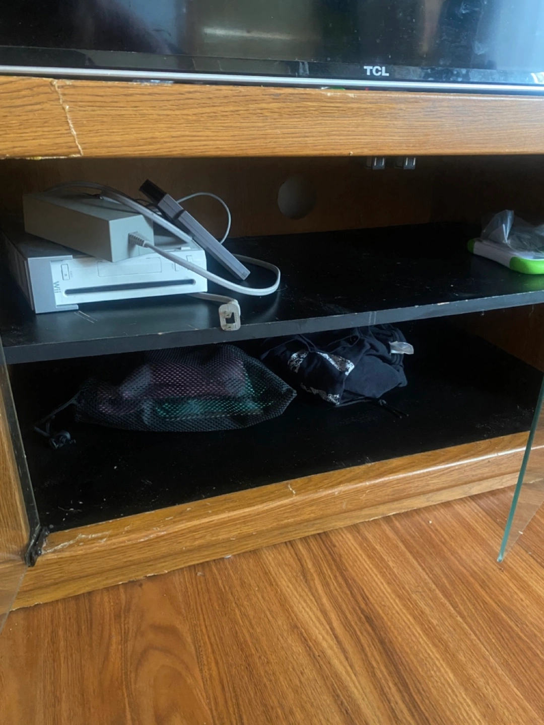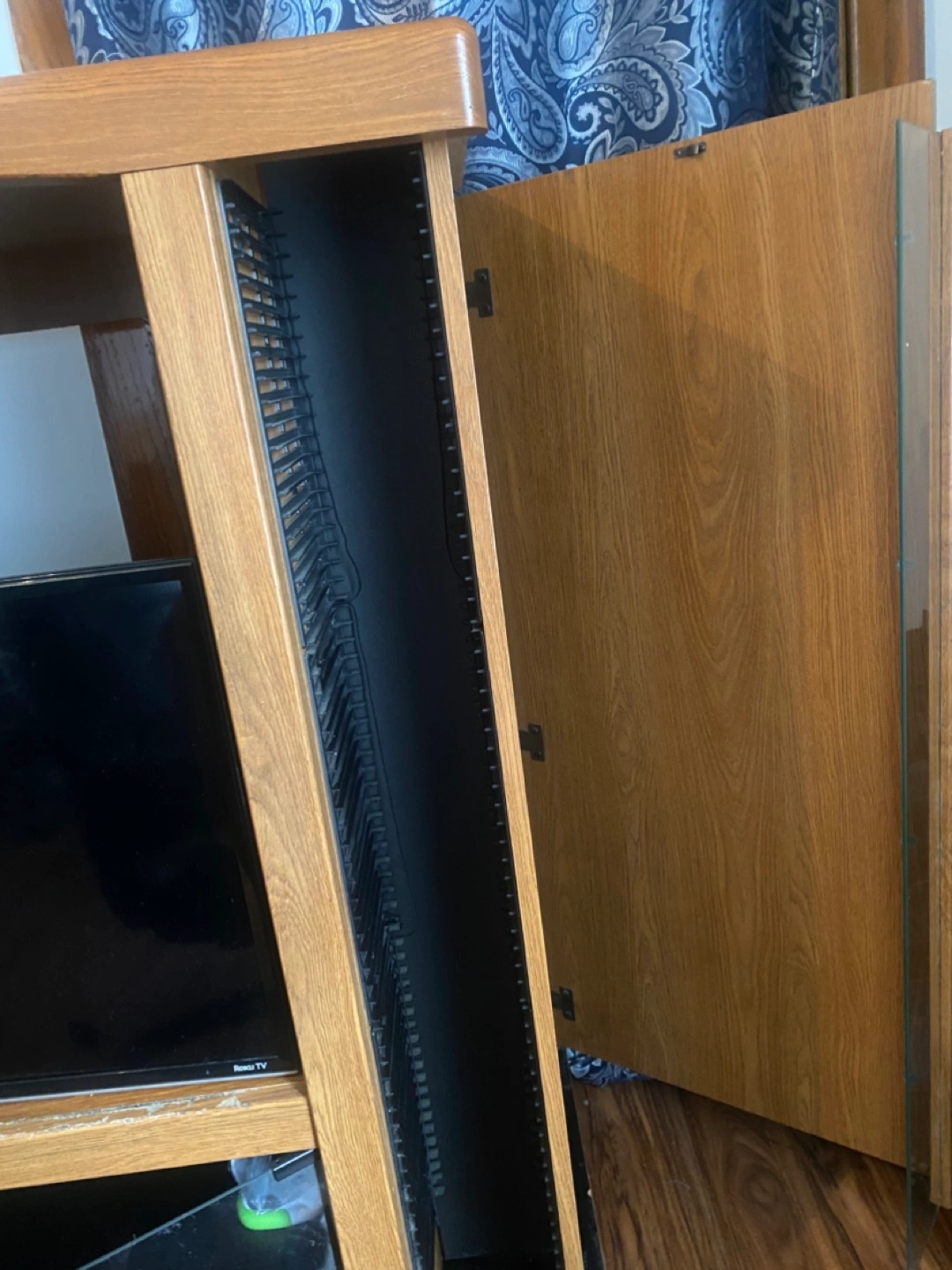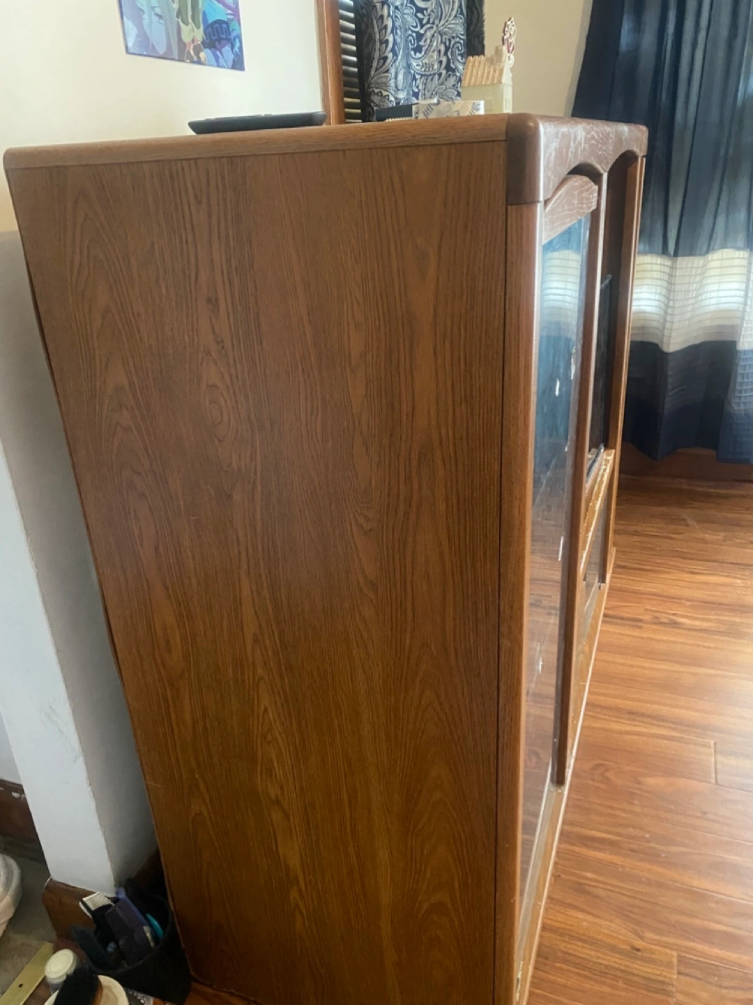 Selling a wooden entertainment center! It has glass doors on the front and shelves for storage. There's plenty of space for a TV and other media devices. Regular wear and tear marks and you have to lift the left door a bit to push it in. Other than that it's in good condition and ready for a new home